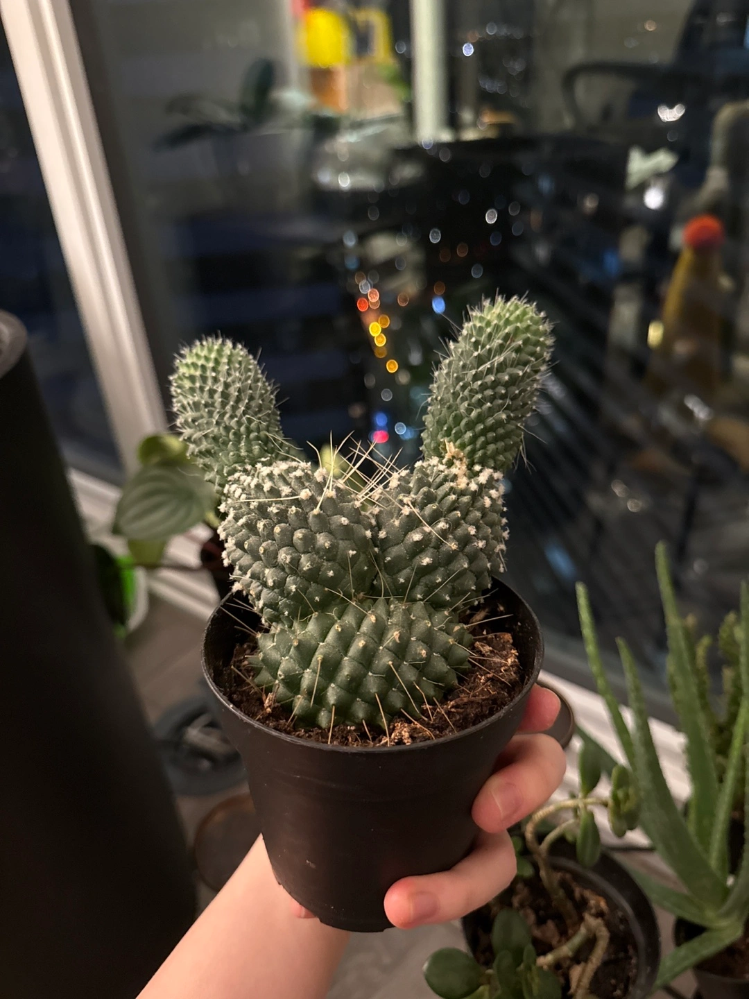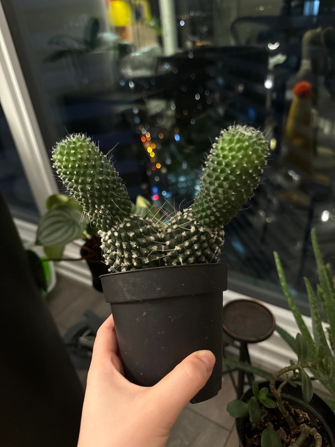 Adorable bunny ear cactus in a small black pot. Healthy and vibrant green. Perfect addition to your plant collection. Needs replantation since it's outgrown the current pot. Perfectly healthy!