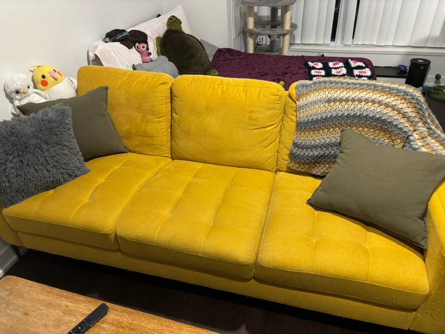 Three-seater sofa, mustard yellow fabric. Some wear and tear visible. Black legs. Comfortable seating. Good for a smaller space.