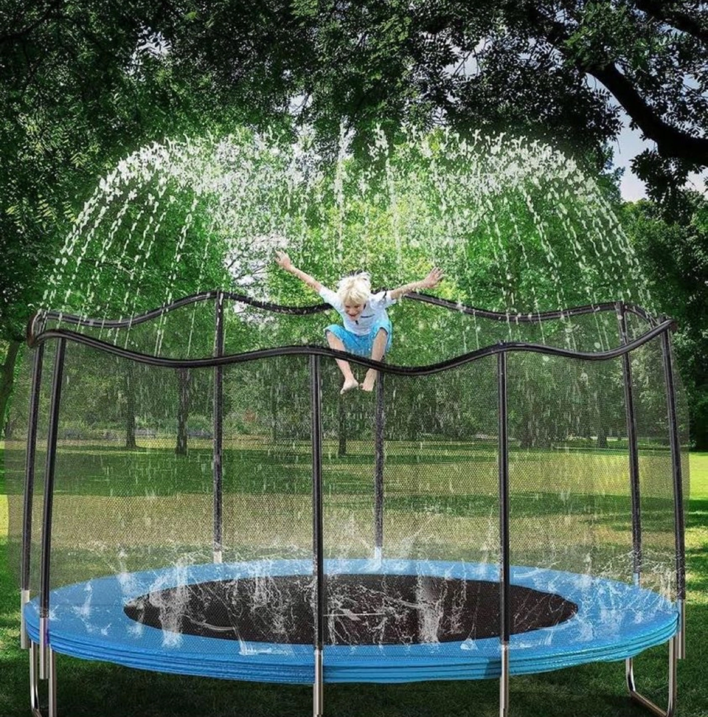Trampoline with Water Mist Sprinkler and Safety Enclosure Net