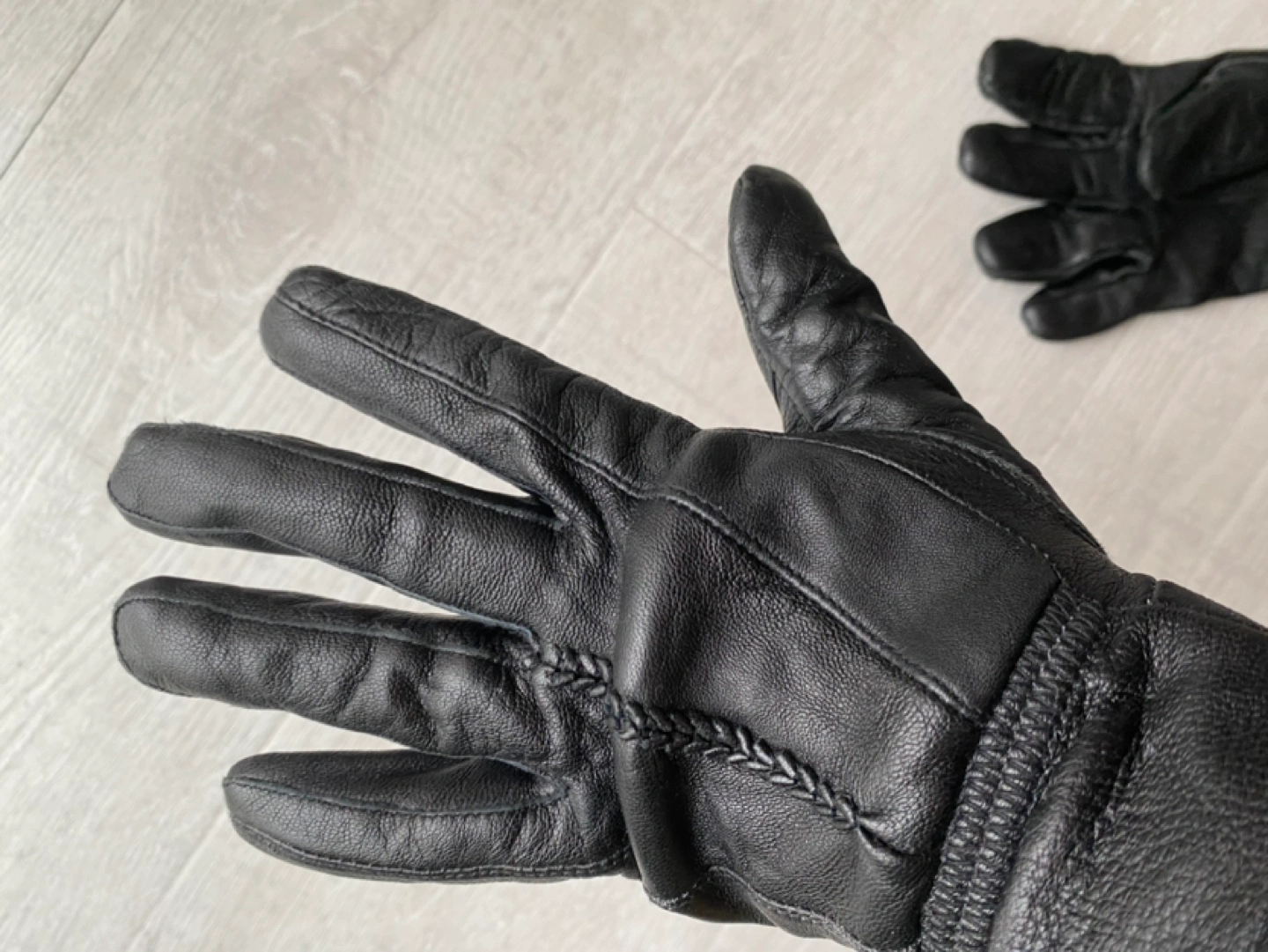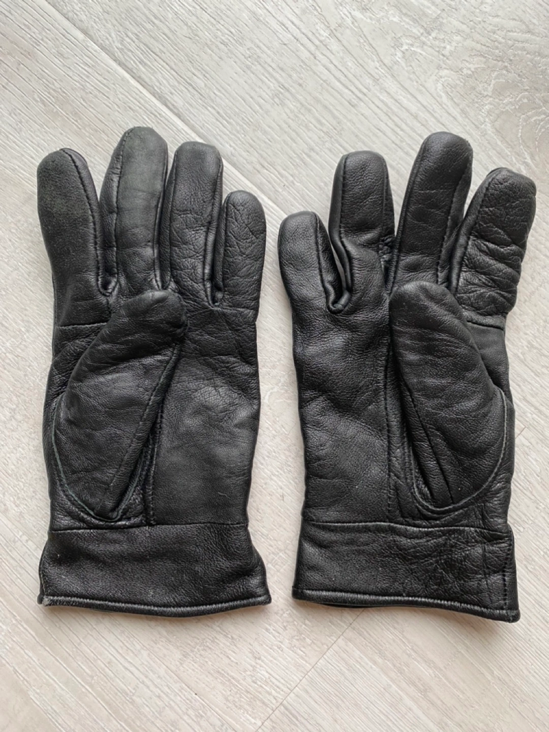 Size M. Lined leather gloves with braided detailing running up the top. Some slight wear on the edge of the left glove.