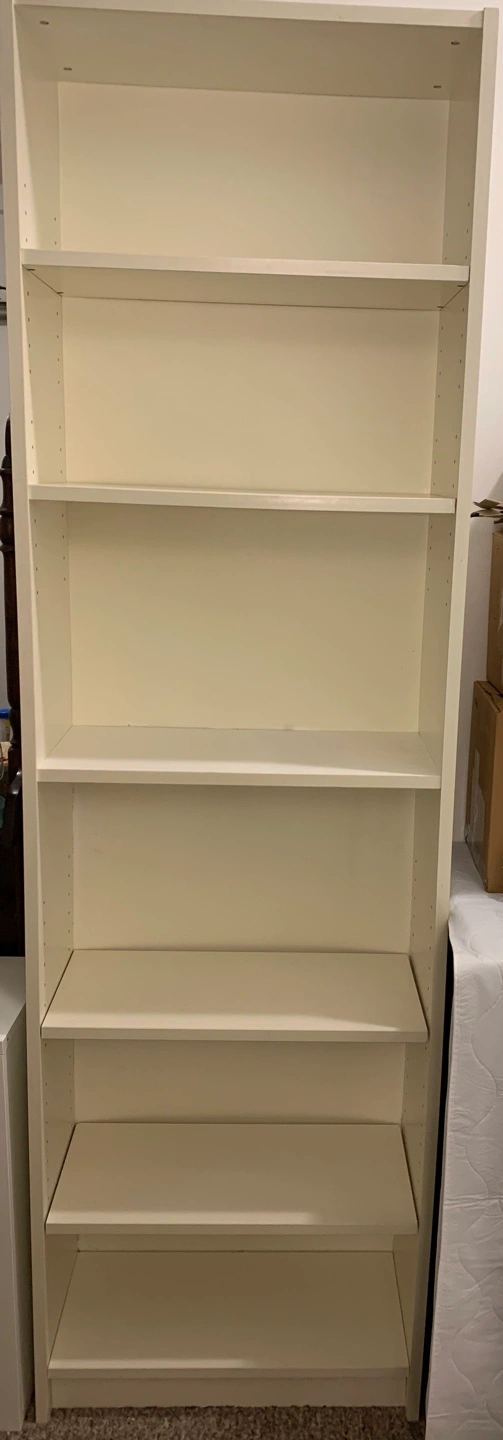 IKEA white bookshelf with five shelves, four are movable and the middle shelf is stationary. Structurally sound shelf with some minor wear.