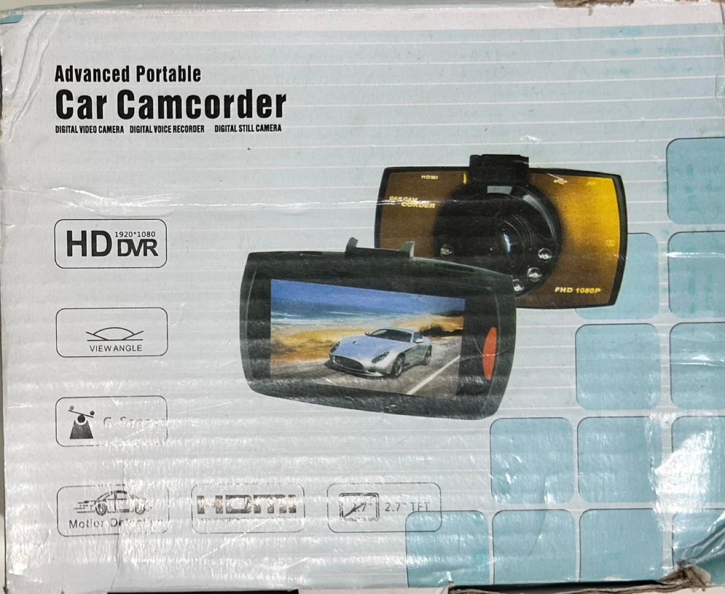 Advanced portable car camcorder. HD DVR, 1920x1080. Digital video camera, digital voice recorder, digital still camera. Includes user manual, car charger, and mounting accessories. Wide view angle.
