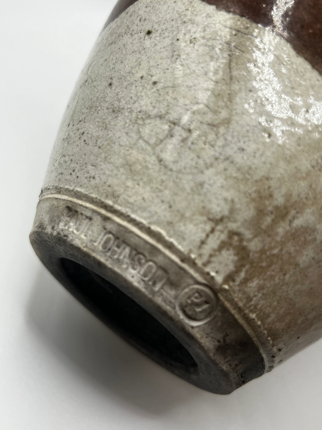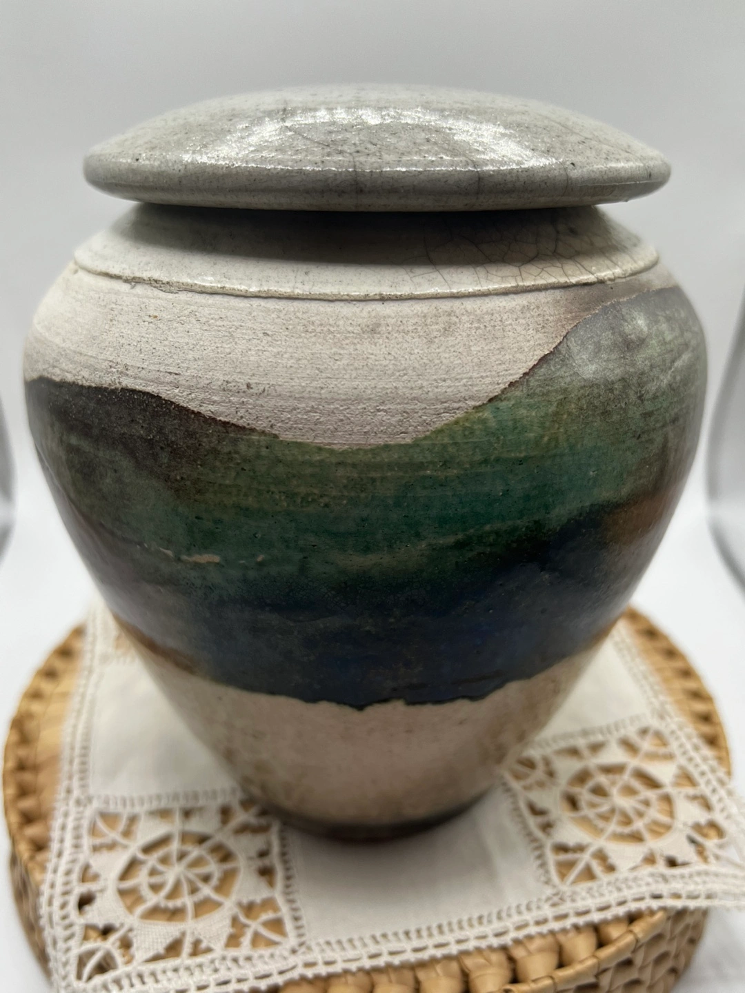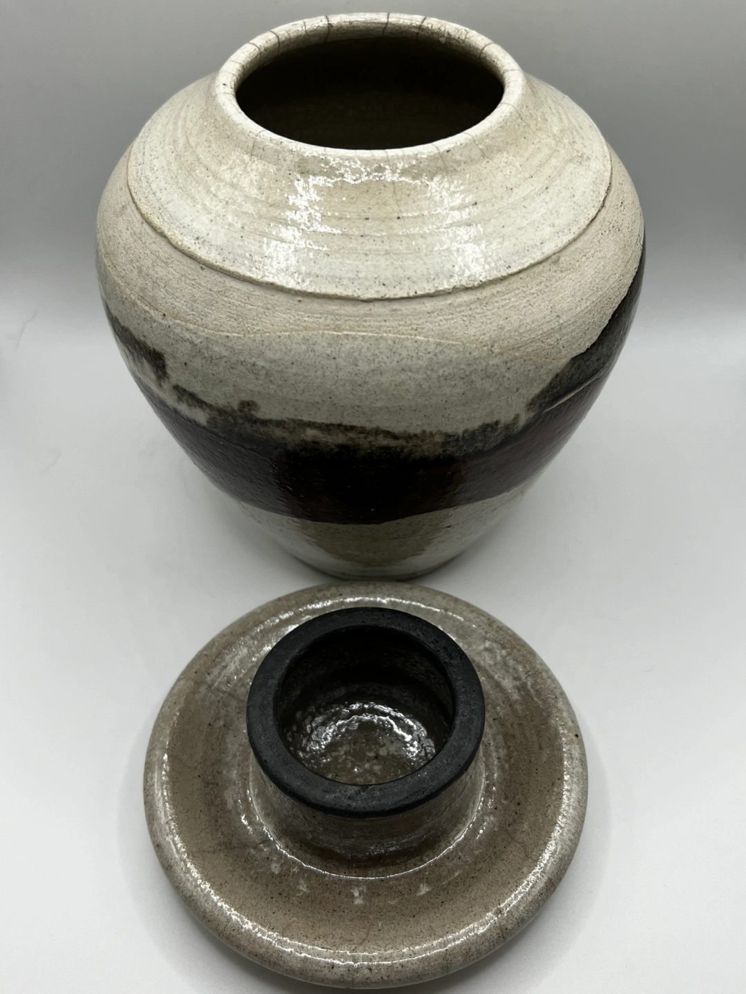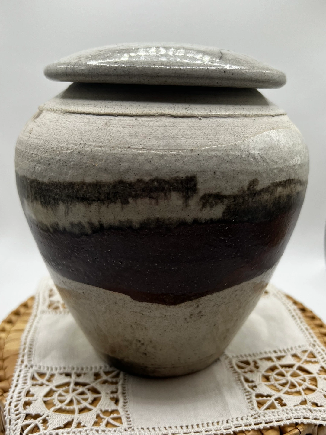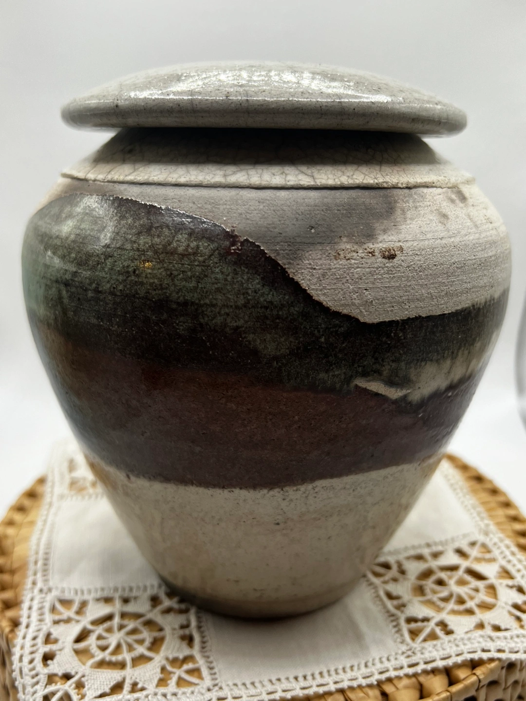 Handcrafted ceramic jar. Features a unique design with bands of brown, green, and off-white. Comes with a fitted lid. Shows some crazing.
