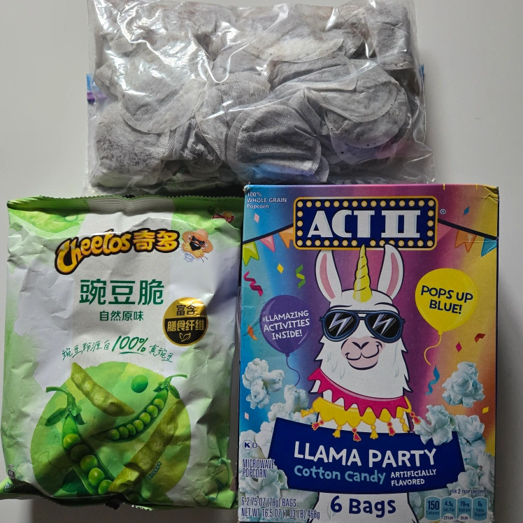 Tea bags, Cheetos brand wasabi peas & Act II Llama Party cotton candy flavoured microwave popcorn.