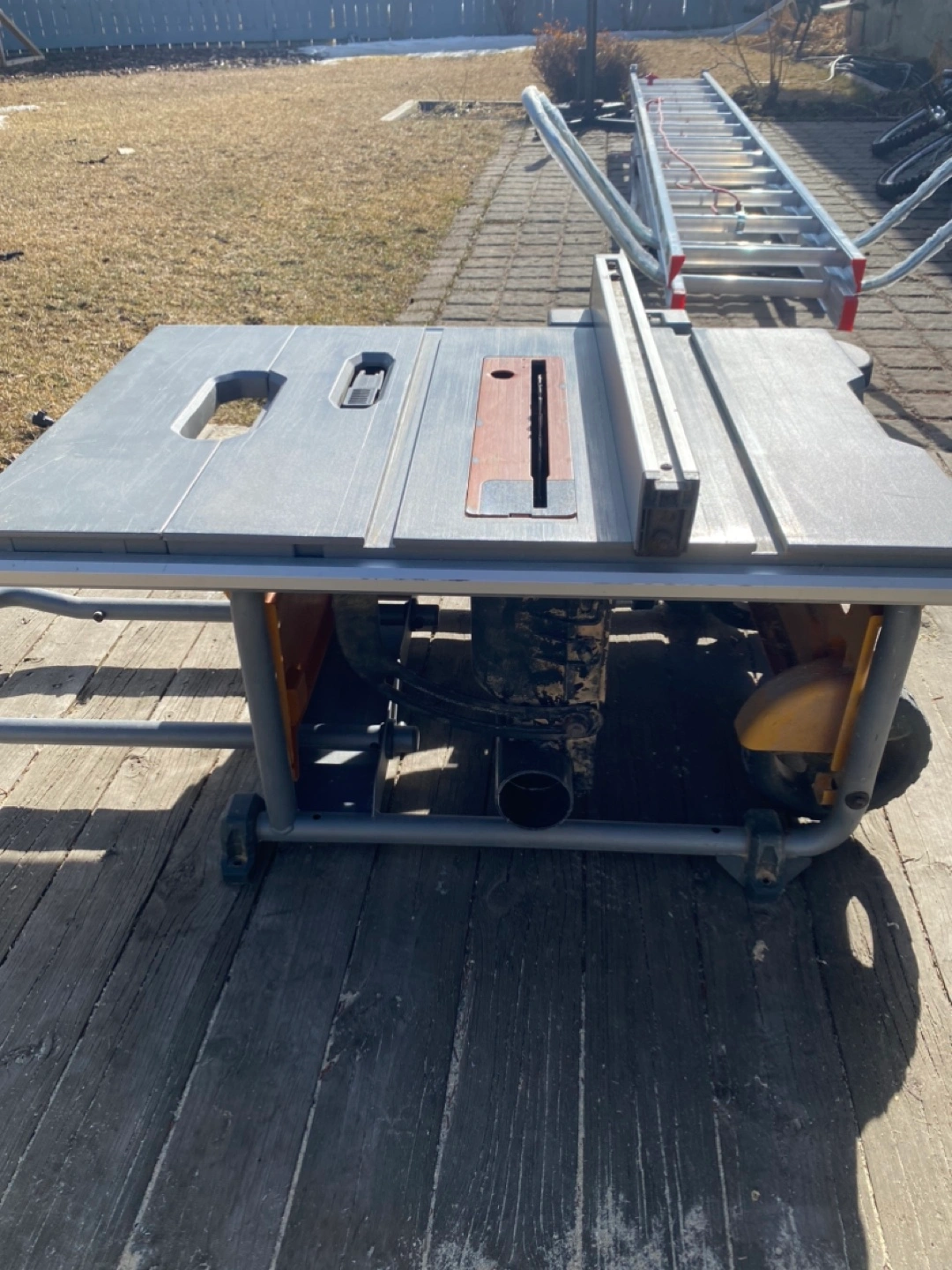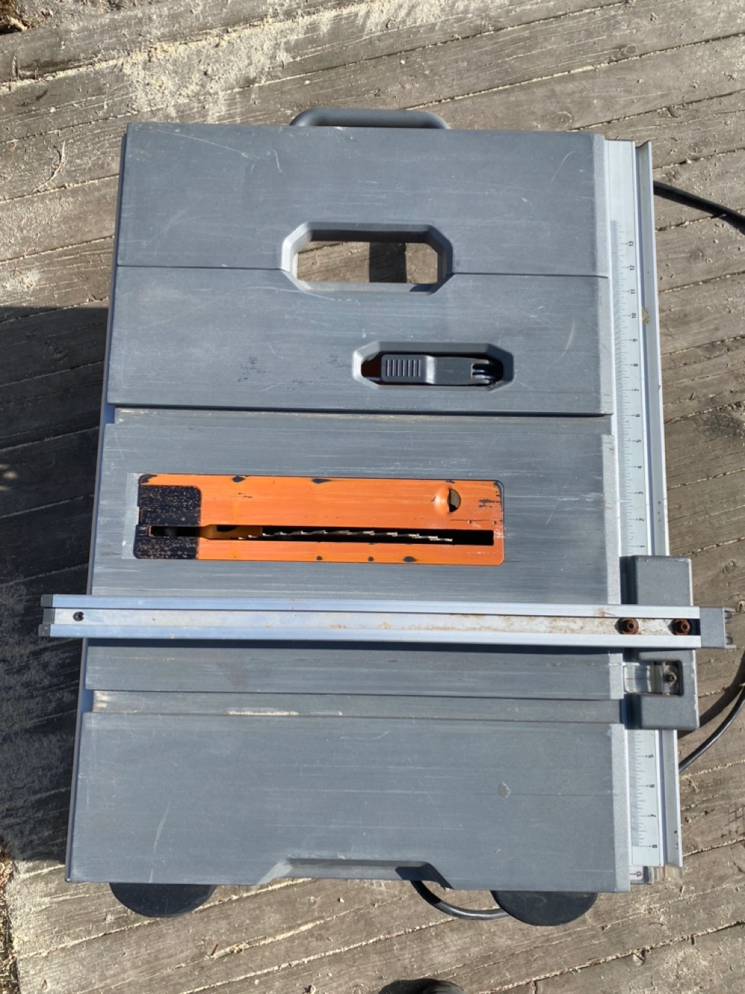 Used RIDGID portable table saw. Gray and orange colour scheme. Includes wheels for portability. Blade included. Some minor wear.