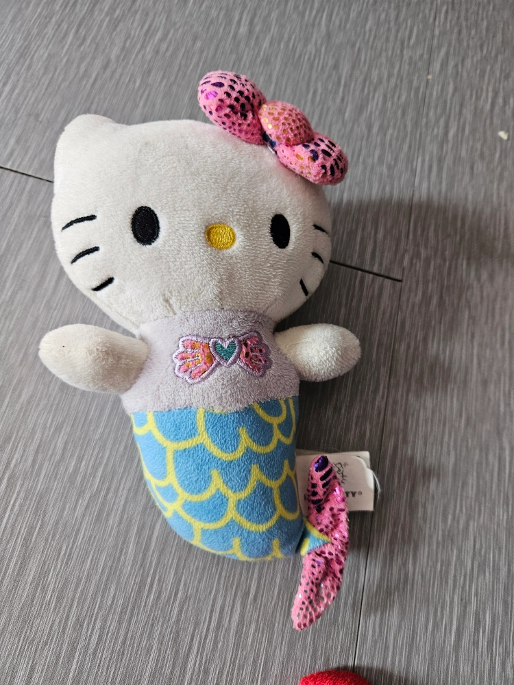 Adorable Hello Kitty mermaid plush. Soft and huggable. Pink bow and sparkly tail. Perfect for kids.