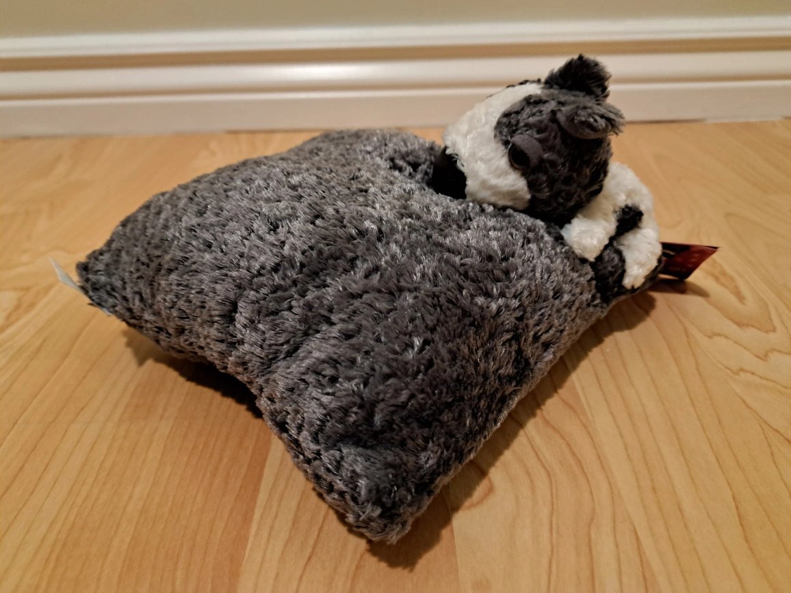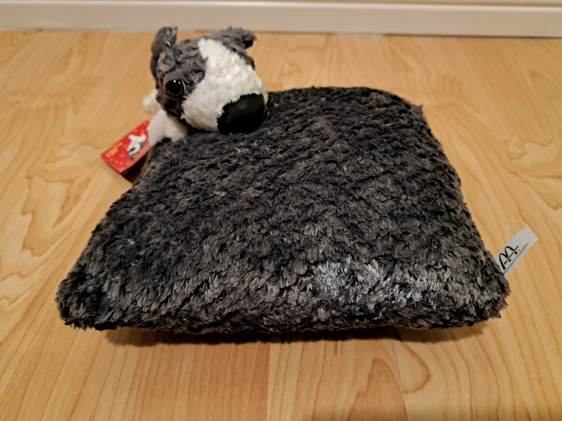 Adorable McDonald's The Dog Papillon plush pillow. Grey fuzzy pillow with attached grey and white dog with tag.