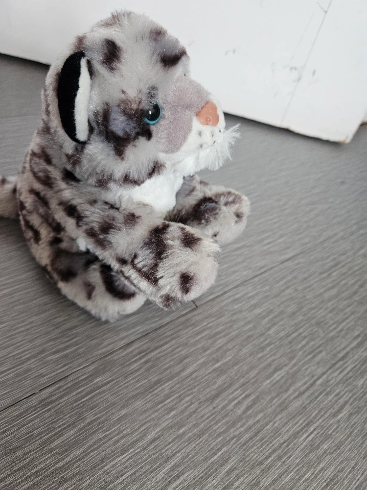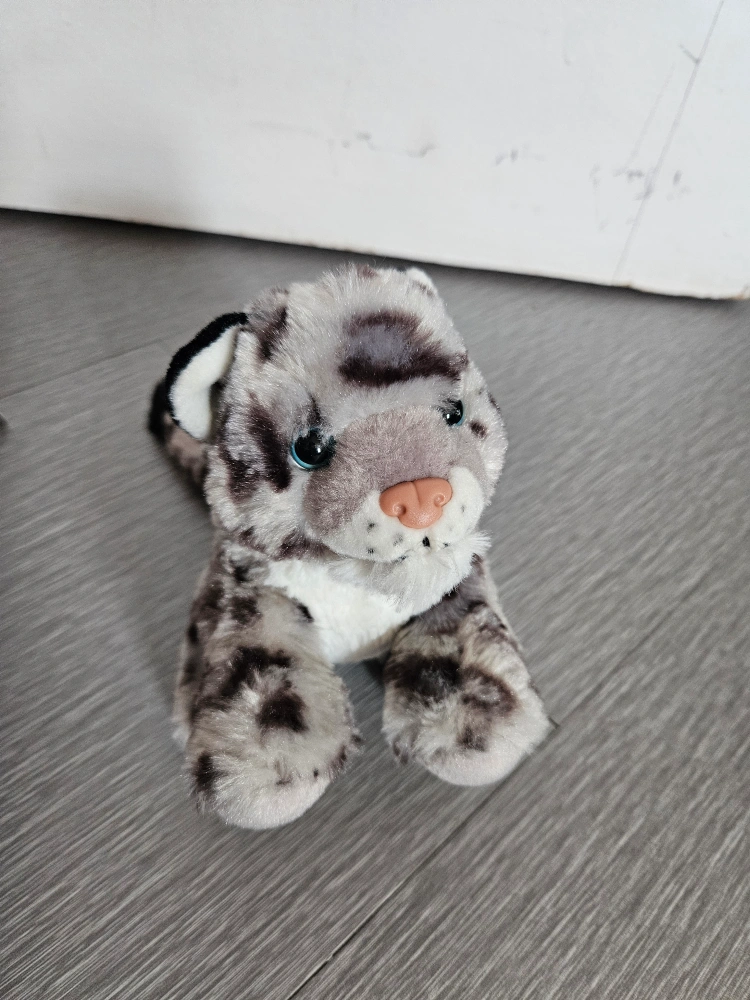 Soft plush snow leopard. Grey and white fur. Small size. Perfect for collectors or children.