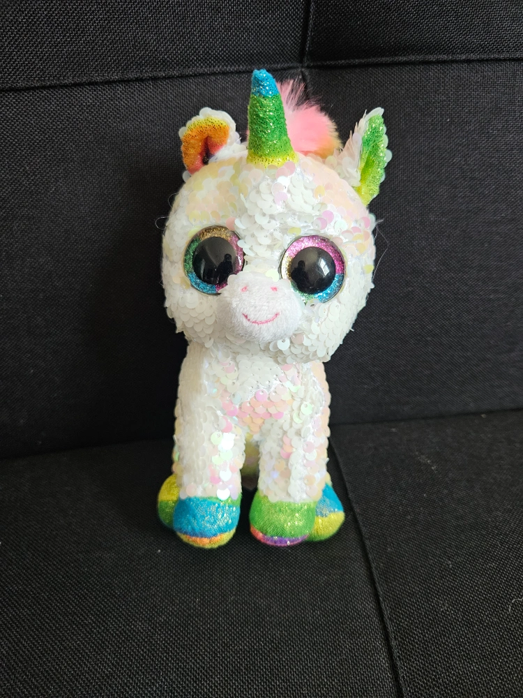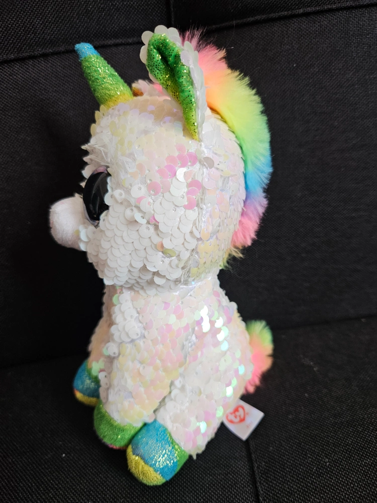 Adorable sequin unicorn. Rainbow mane and tail. Large eyes. Colorful hooves. Collectible plush toy.