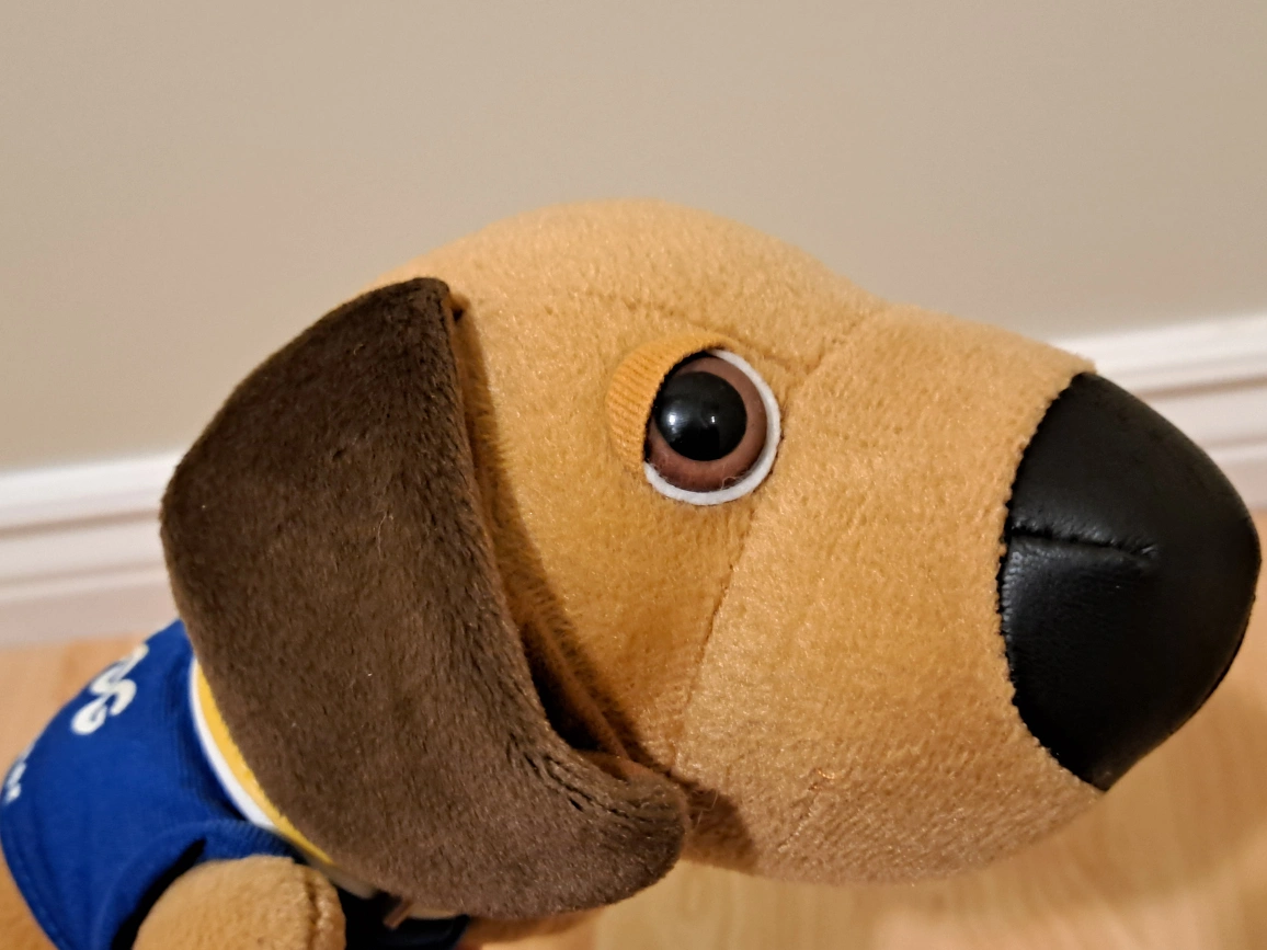 Adorable plush toy dog. Brown and tan fur. Wears a blue shirt with yellow accents. Part of the Happy Petleser Habrador collection.