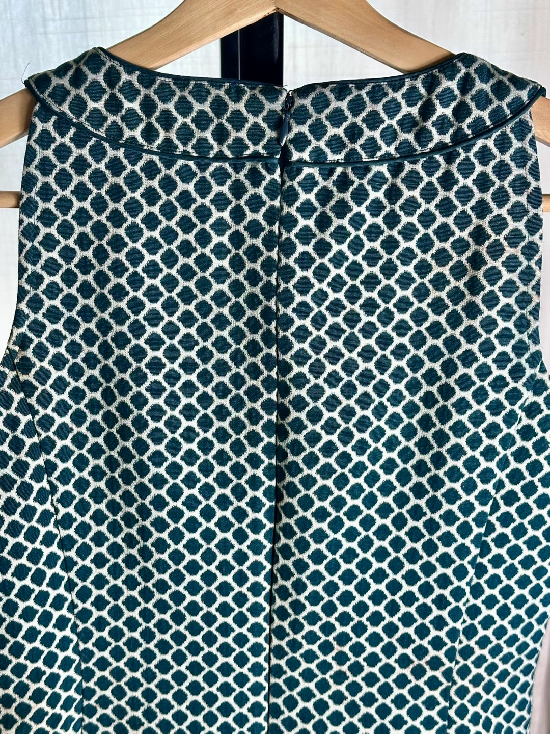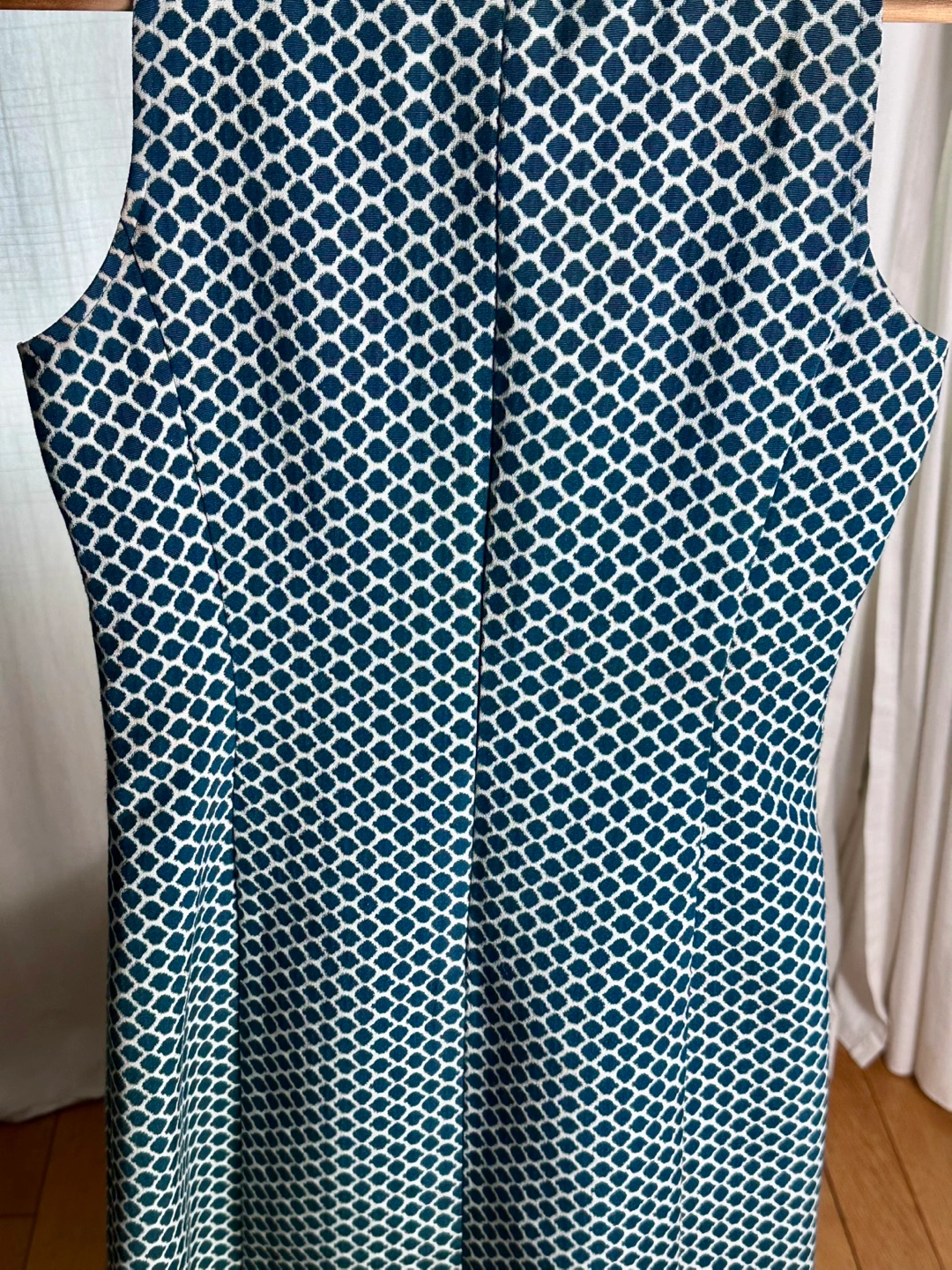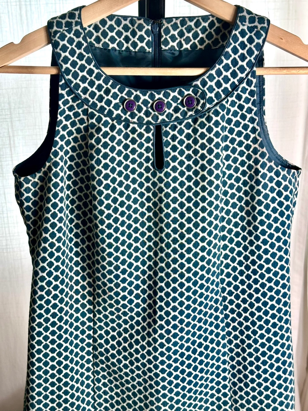 Sleeveless shift dress. Teal and white geometric pattern. Round neckline with decorative buttons. Hidden zipper at the back. A-line silhouette. Great for any occasion.