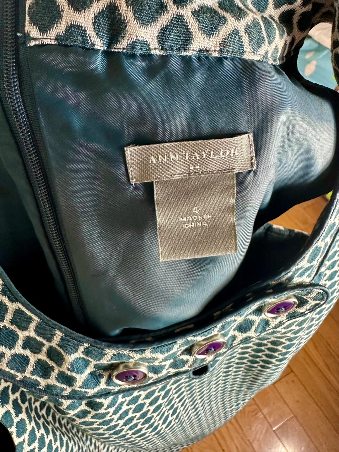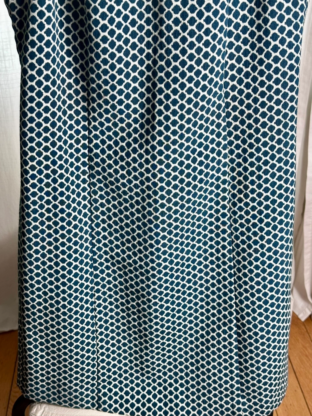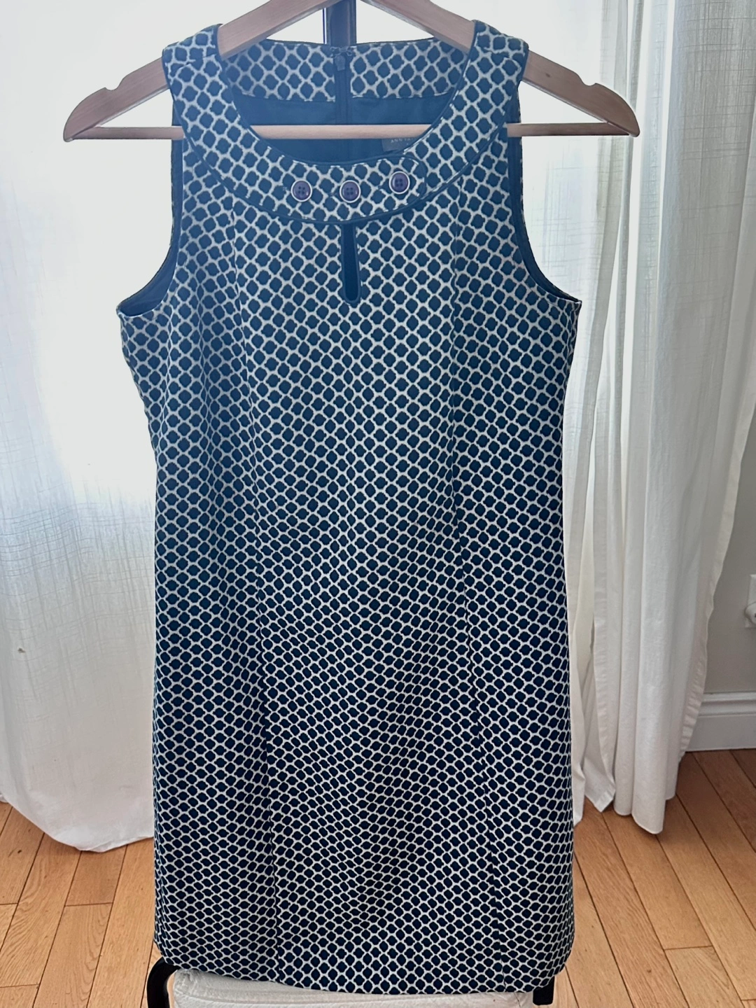 Sleeveless shift dress. Teal and white geometric pattern. Round neckline with decorative buttons. Hidden zipper at the back. A-line silhouette. Great for any occasion.