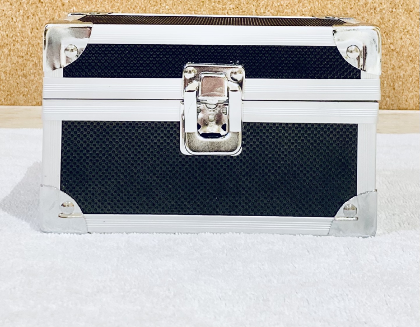 Small aluminum storage case. Black interior. Silver metal accents. Latch closure. Perfect for travel or organization. Trunk box design.