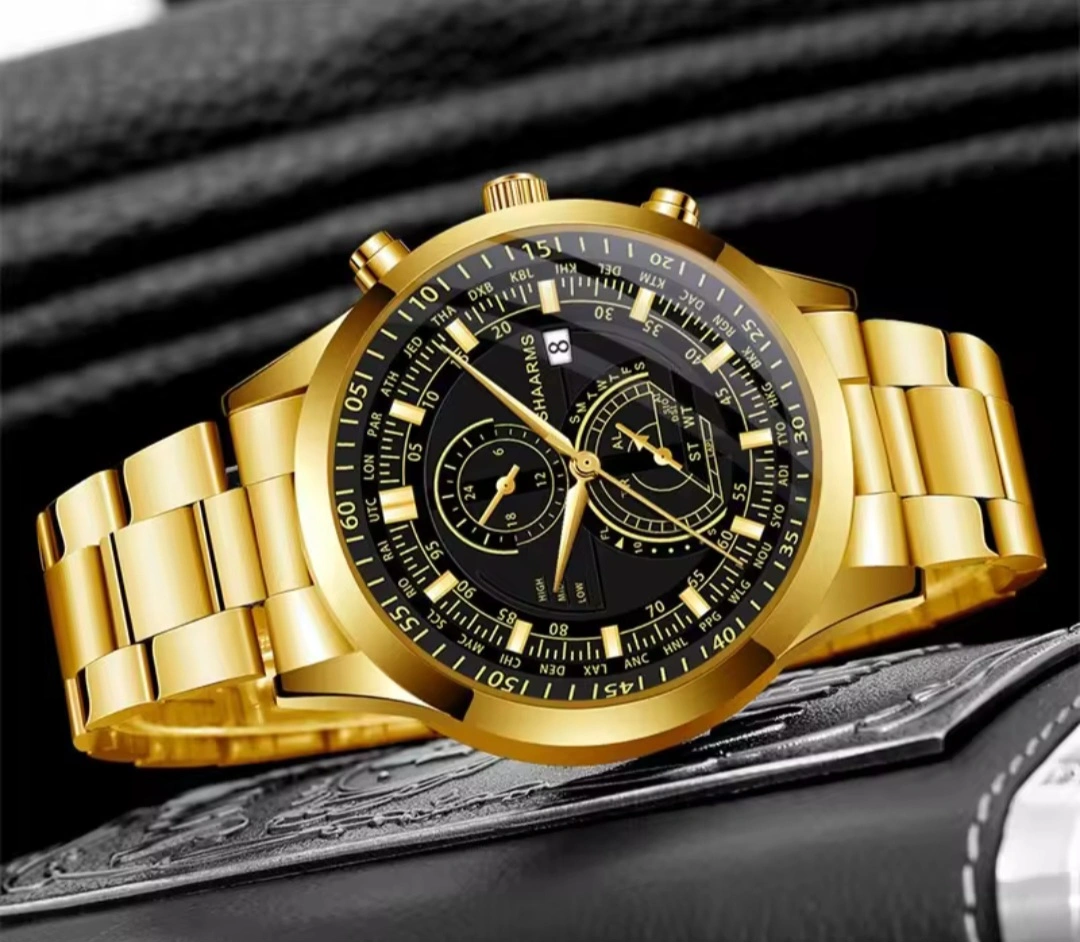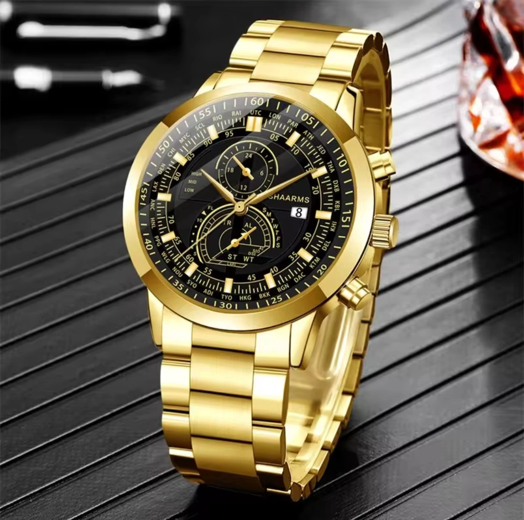 74Stylish gold men's watch. Features a black face, multiple sub-dials, and a stainless steel band. Includes a matching gold bracelet. Quartz movement.
