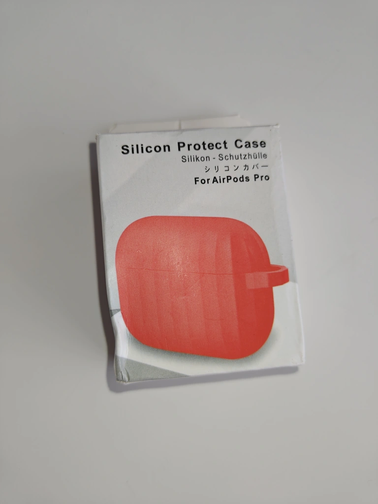 Protective silicone case for AirPods Pro. Red colour. Includes a small carrying loop. Soft, flexible material. Pre-owned, good condition.