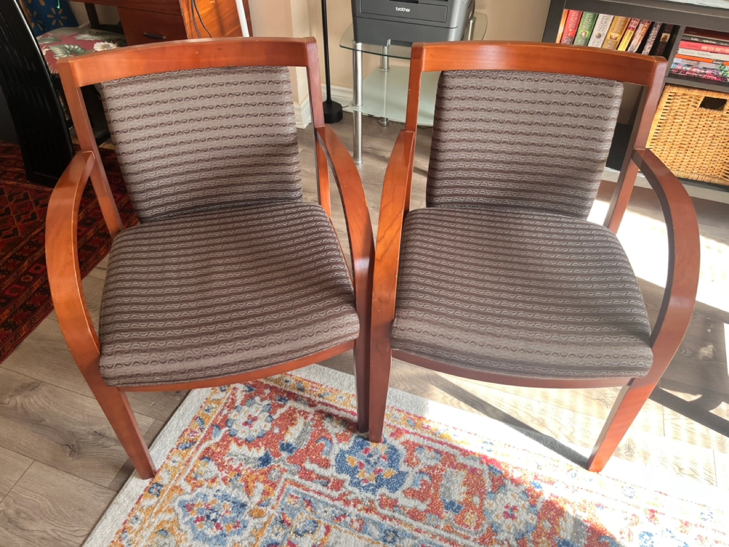 Selling both together. Not 100% sure if they're real wood but they are sturdy. Seats can be easily removed and reupholstered.