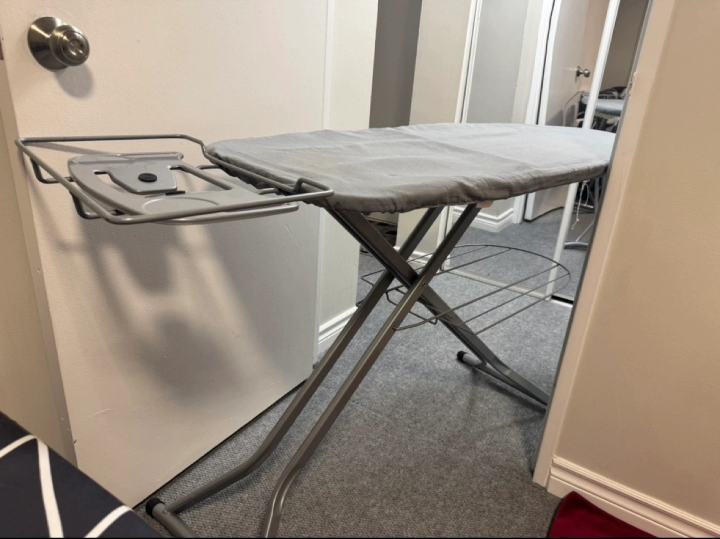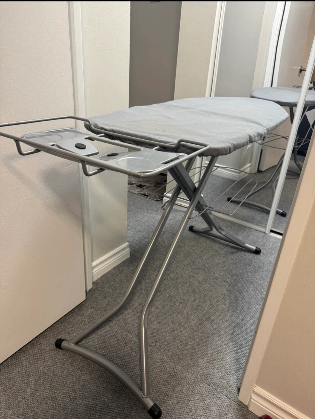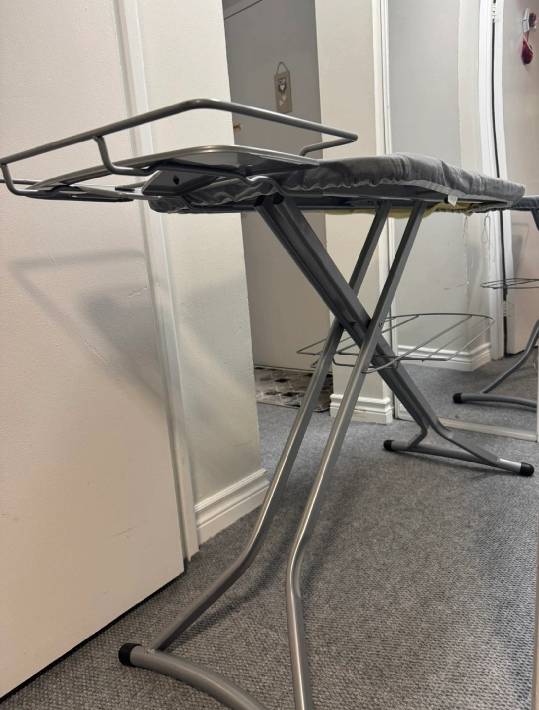 98Grey ironing board, metal frame. Features a shelf for storage and an integrated tray. Easy to fold and store.