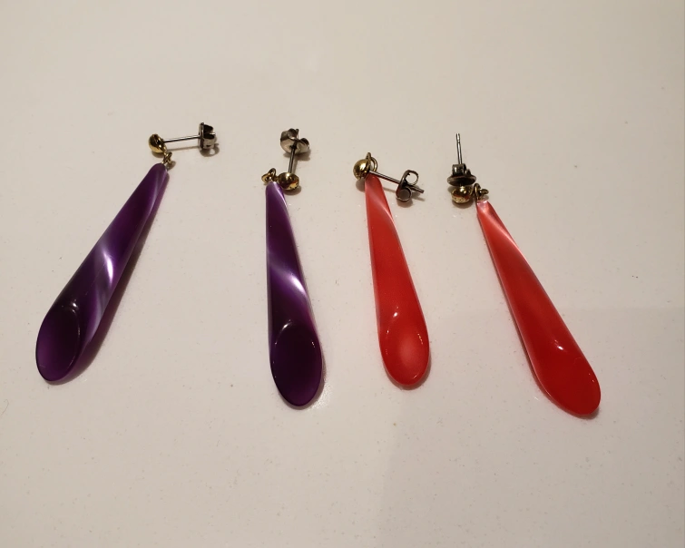Two pairs statement earrings. Two pairs, one purple and one coral. 1 1/2" approx long teardrop shape. I have had these since the early 80's (oh yes I have pictures with a much younger me wearing them lol)