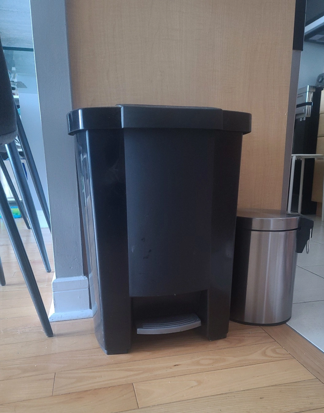 Large black plastic trash can(About half the height of a dining chair): Foot pedal operation. Good condition.
