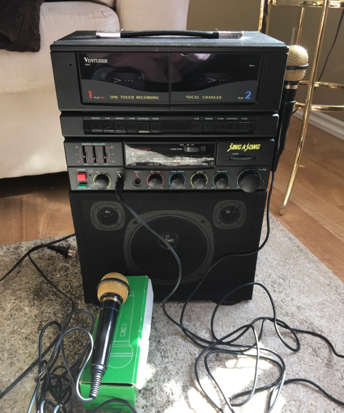 Vintage karaoke machine. Includes double cassette deck, AM/FM radio, graphic equalizer, and two wired microphones. Speaker crackles a little when tuning or adjusting, but still works! Excellent for parties.