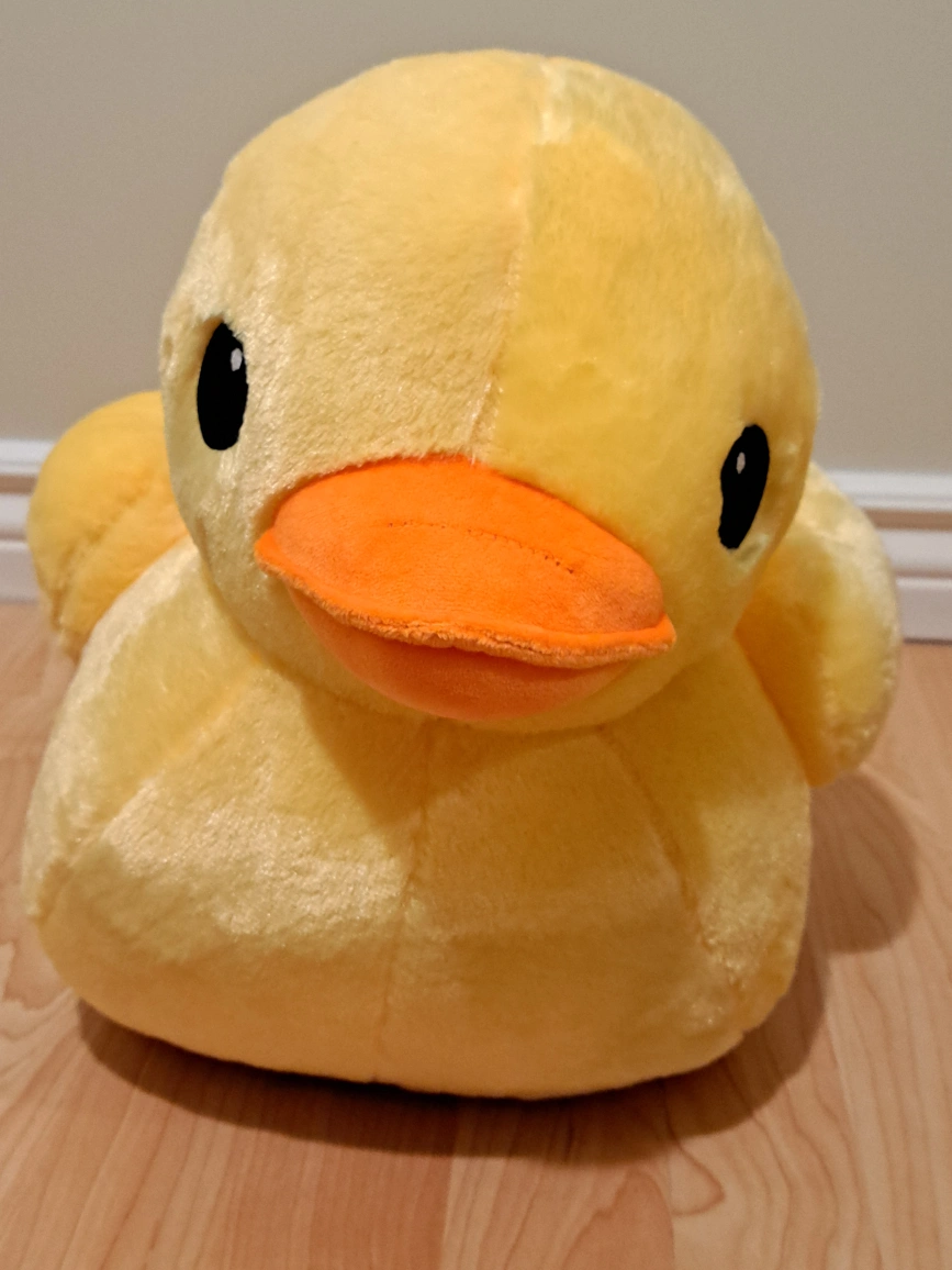 Adorable large plush duck. Soft and cuddly. Perfect for kids or collectors. Measures approximately 13 inches tall.