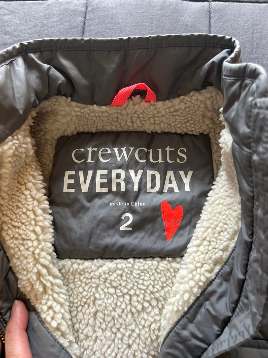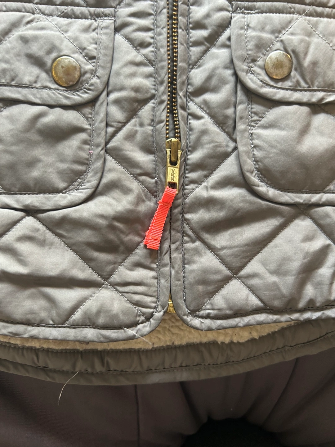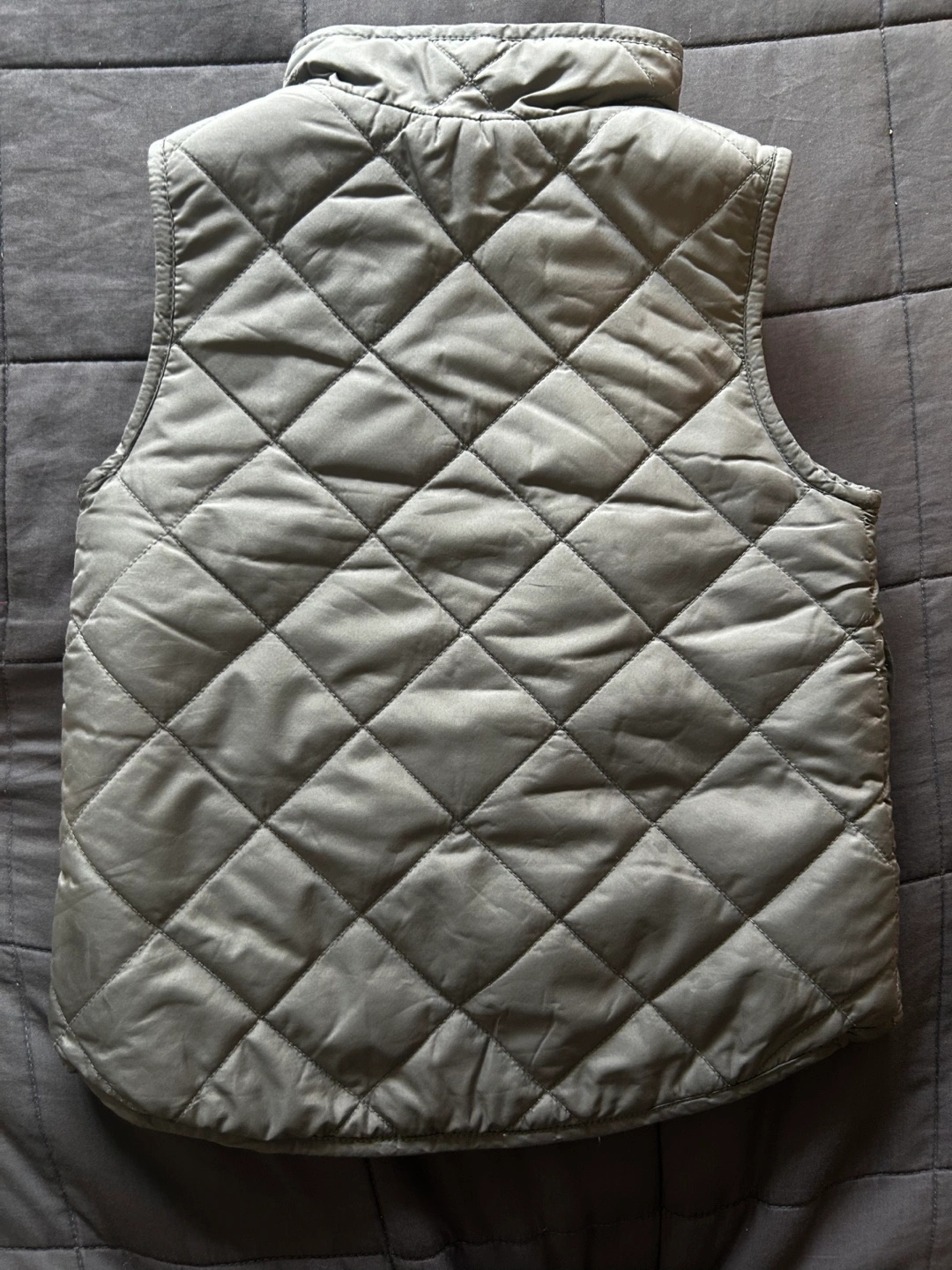 Grey quilted vest. Size 2. Features a sherpa lining and two front pockets. Zipper closure. Perfect for Spring layering.