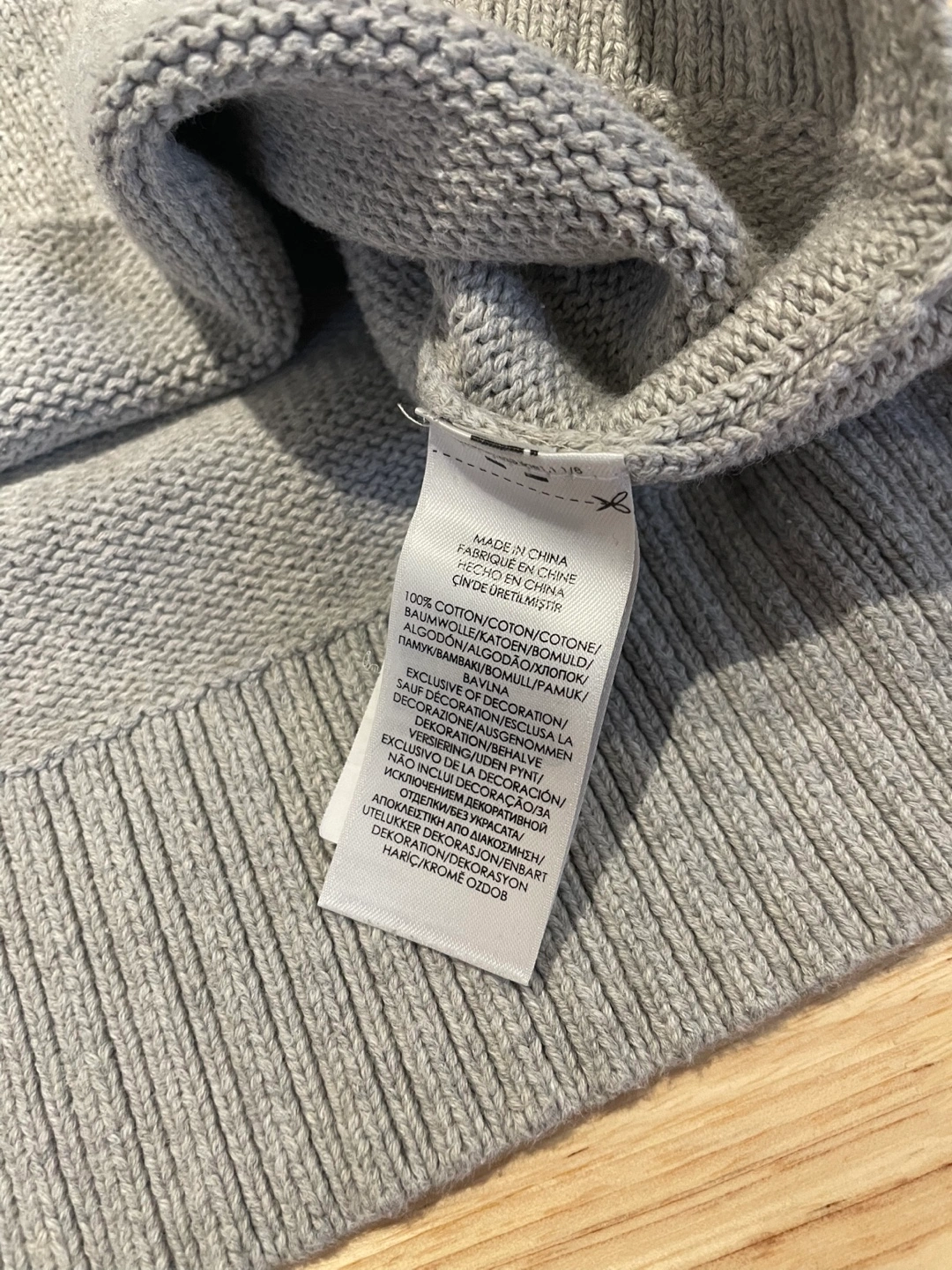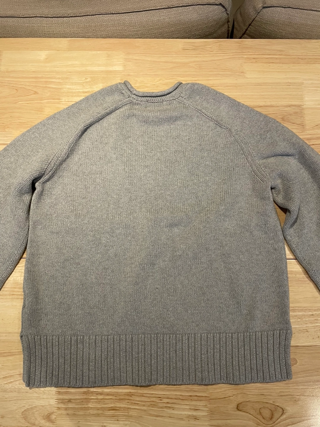 Women's grey Polo Ralph Lauren sweater. Small hole near the center. Long wide sleeves, ribbed cuffs and hem. Crew neck. 100% cotton.