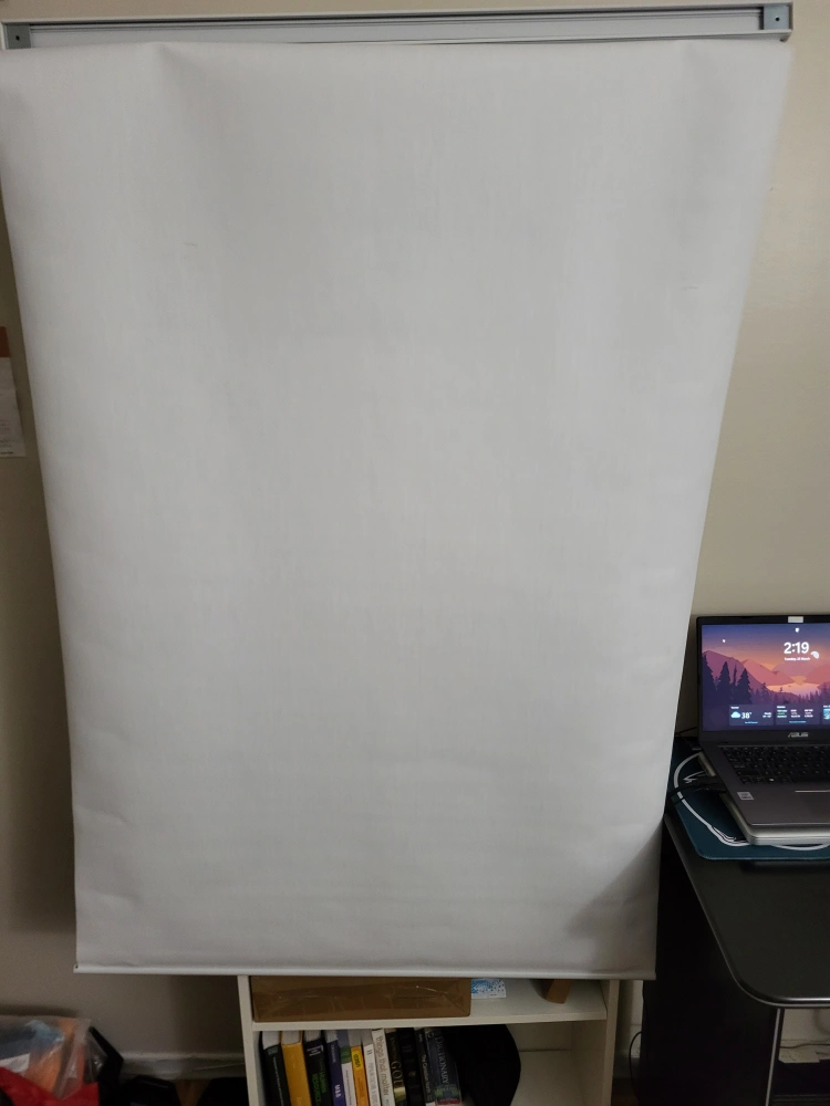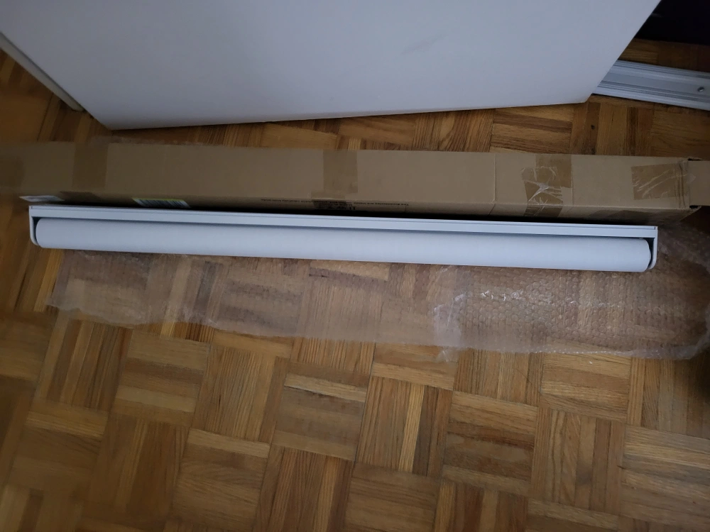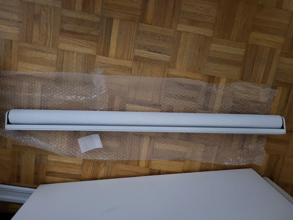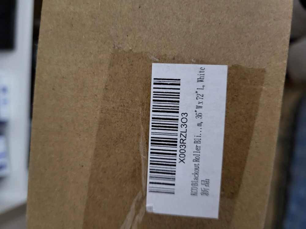 Comes in box, white blackout roller blind. Measures 36 inches wide by 72 inches long. Easy installation.