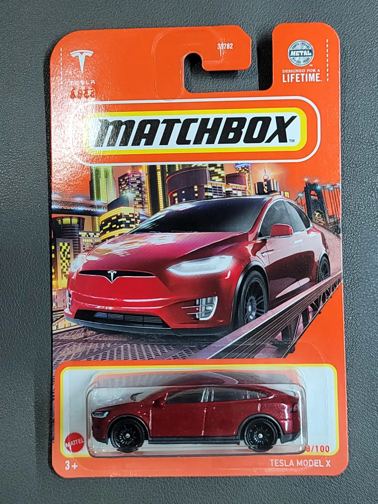52Matchbox die-cast car. Red Tesla Model X. Part of a 100-piece set. Collectible. For ages 3+