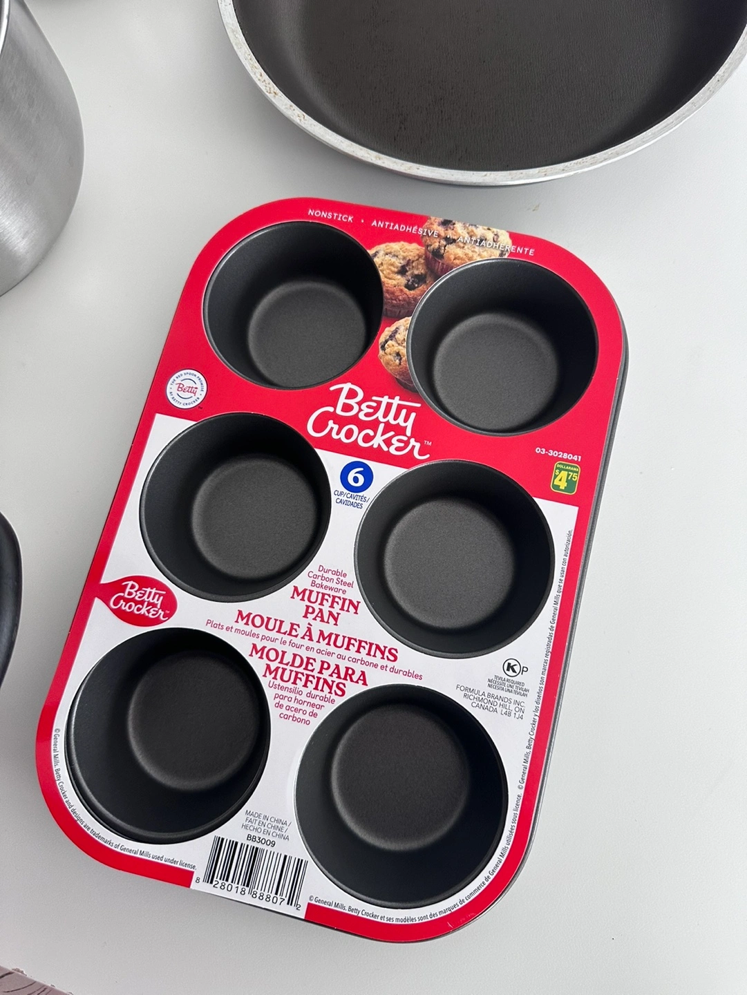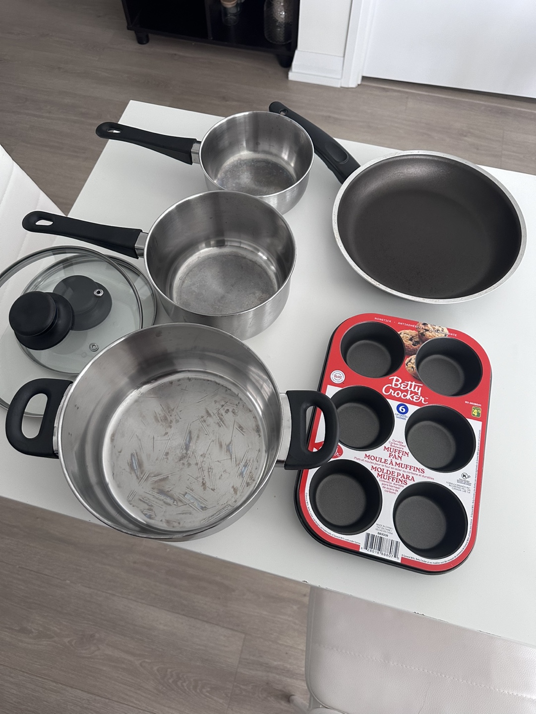 Stainless steel pots with lids, non-stick frying pan, and a six-cup brand new Betty Crocker muffin tin. Used condition, some minor staining.