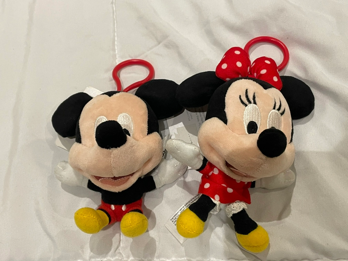Adorable Mickey and Minnie Mouse plush keychains. Small, collectible, and perfect for bags or keys. Red and white accents. Soft plush material.