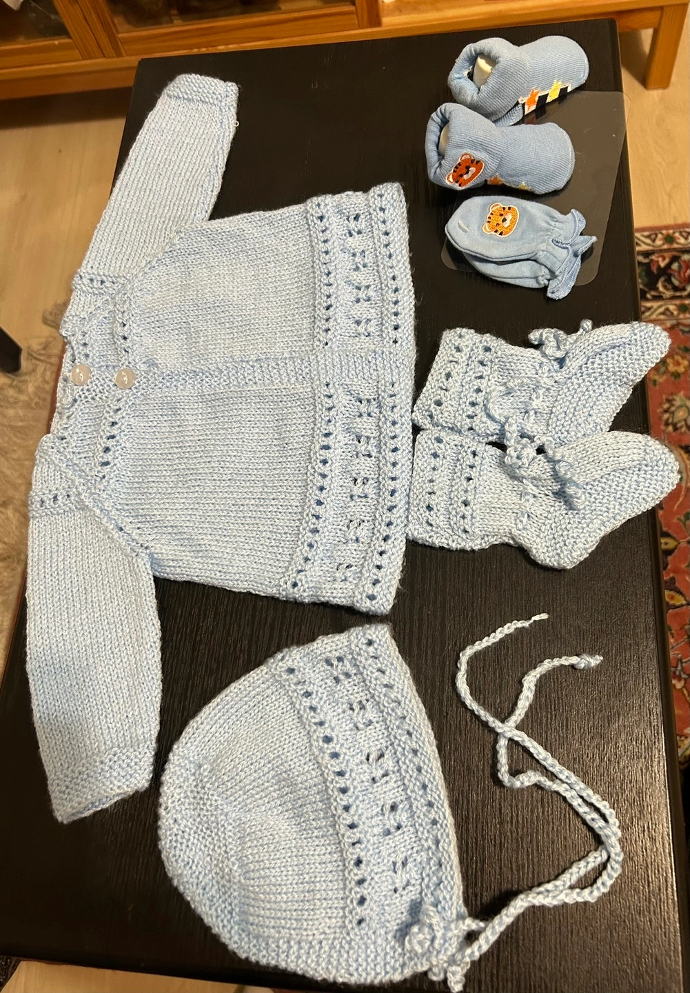 Adorable baby boy outfit, hand-knitted in a lovely light blue. Includes a cardigan sweater, matching hat, booties, and mittens. Perfect for newborn photos or a special occasion. Gently used.