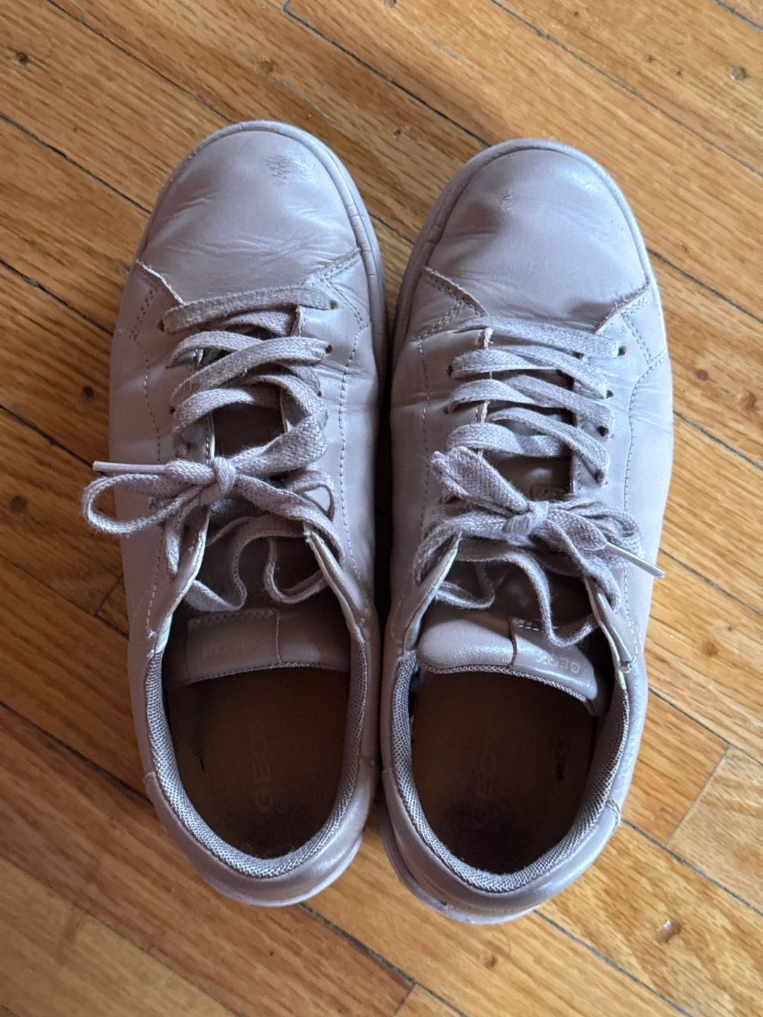 Pair of women's beige leather sneakers. Comfortable and stylish. Size US 8.