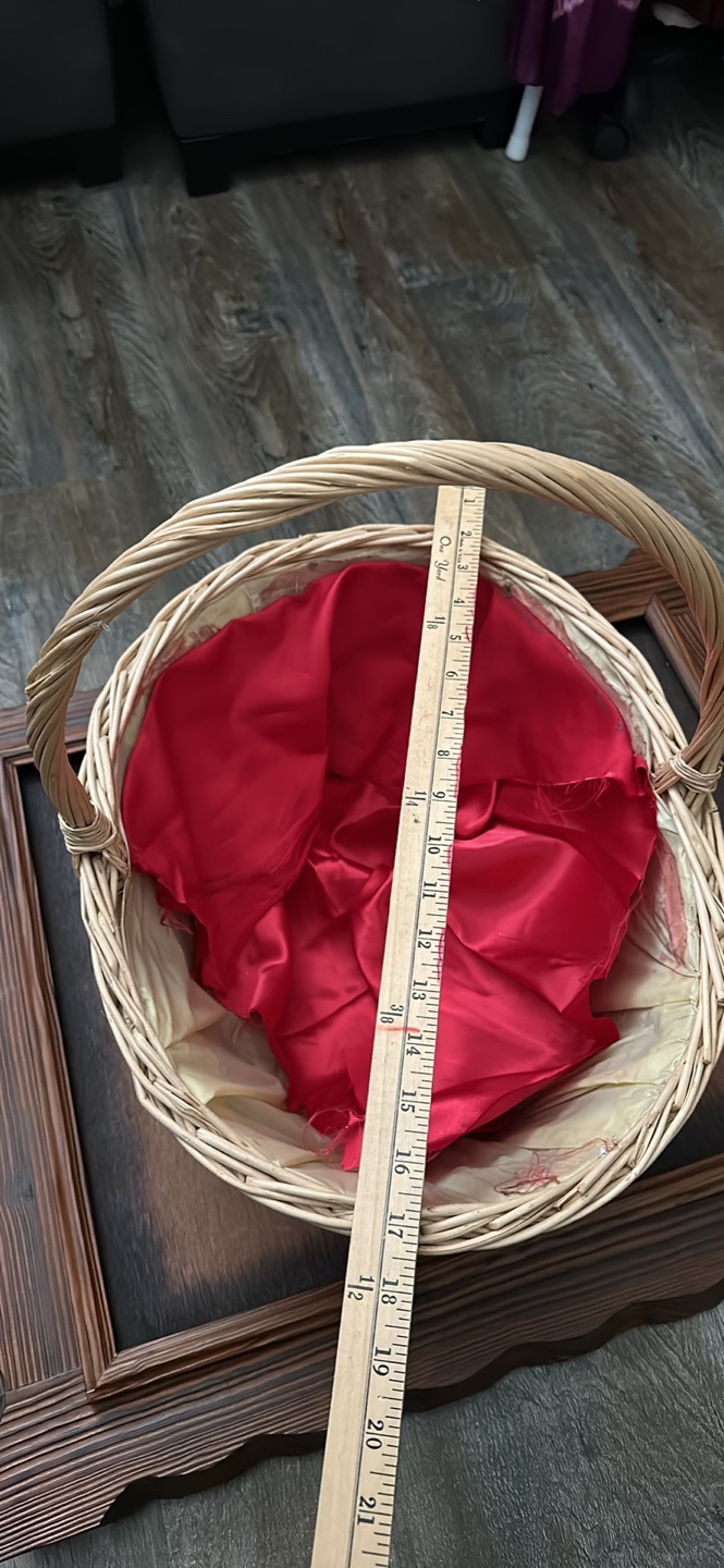Large wicker basket. Features a red satin liner. Perfect for gift giving or storage. Liner needs gluing.