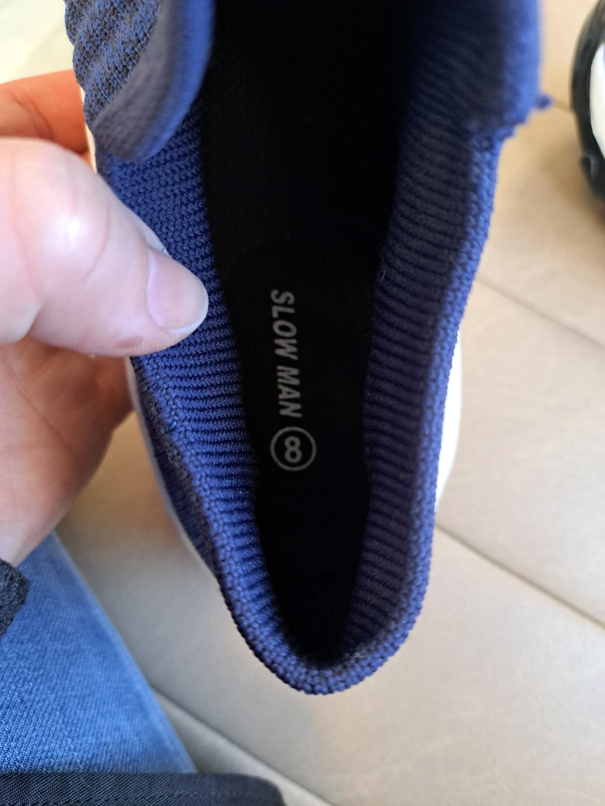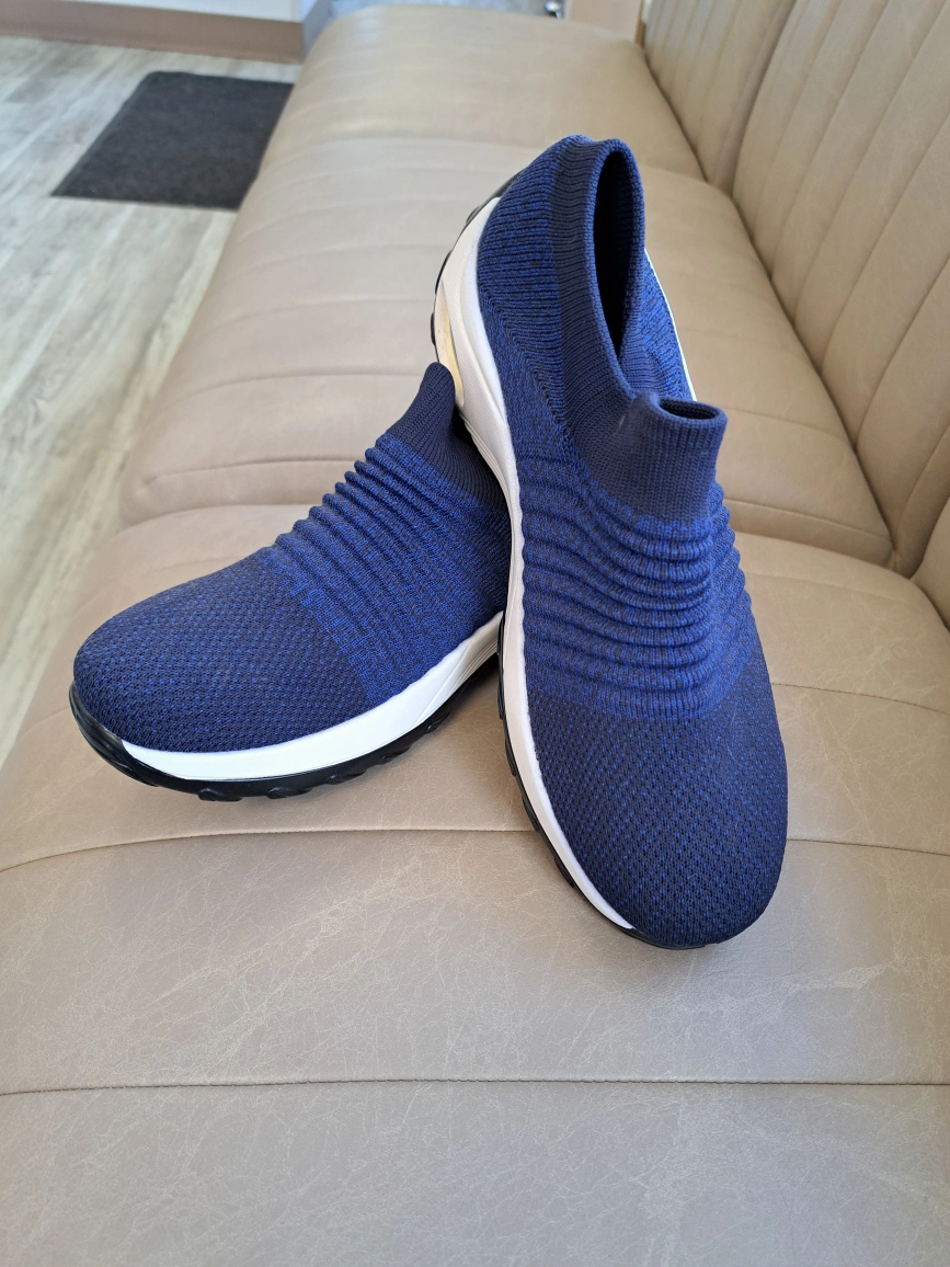 Navy blue slip-on athletic shoes. Knit fabric upper. Comfortable and lightweight. Great for casual wear.
