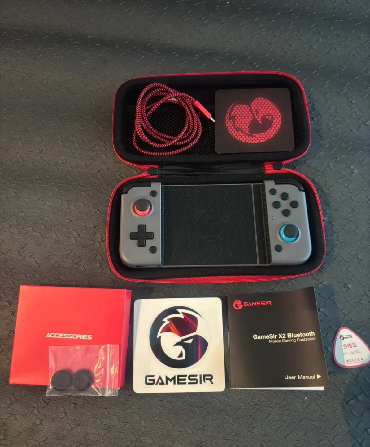 Includes everything in the original box. Controller, case, charging cable, thumbstick caps and instruction booklet.