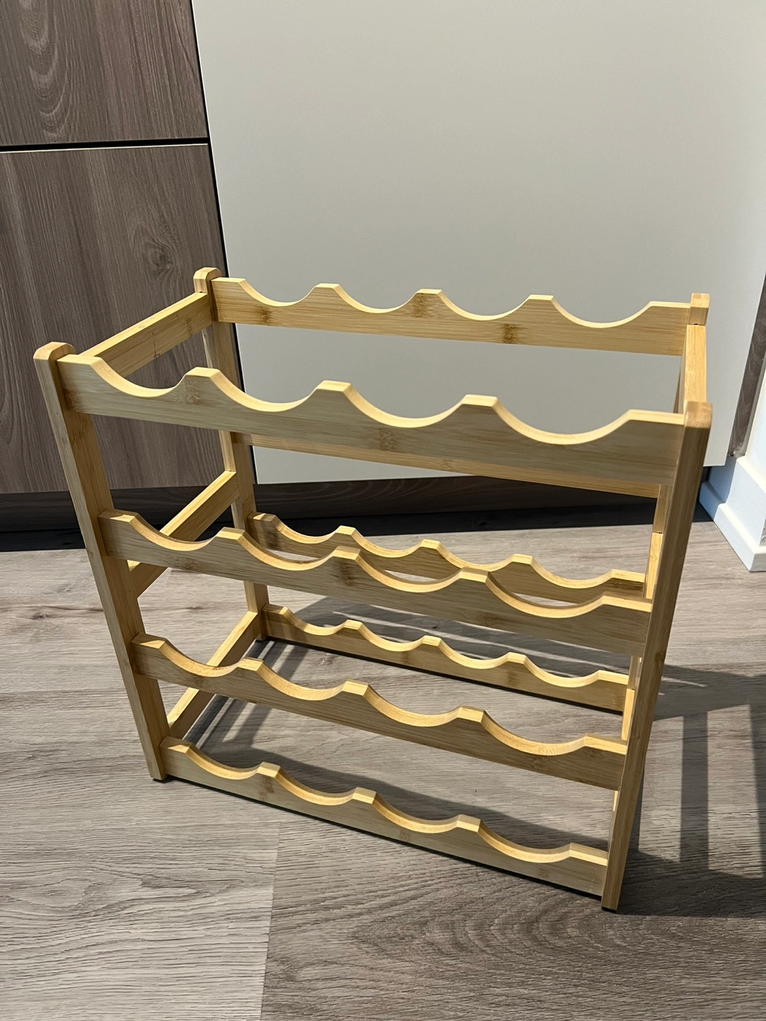 Four-tier bamboo wine rack. Holds sixteen bottles. Sturdy and durable. Great for pantry or countertop. Easy to assemble and disassemble. Rarely used. Need it to go due to no space. Amazon link: https://a.co/d/2suDKkO