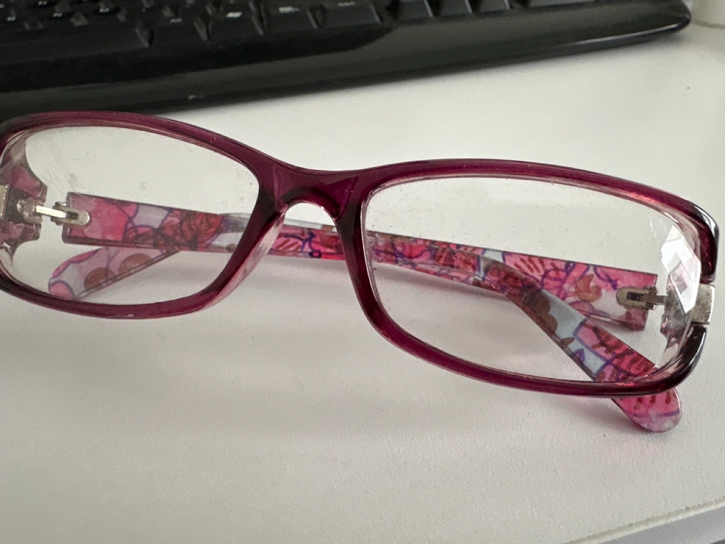 132Pre-owned women's reading glasses . Purple frame with floral pattern. Clean lenses. Some minor wear.