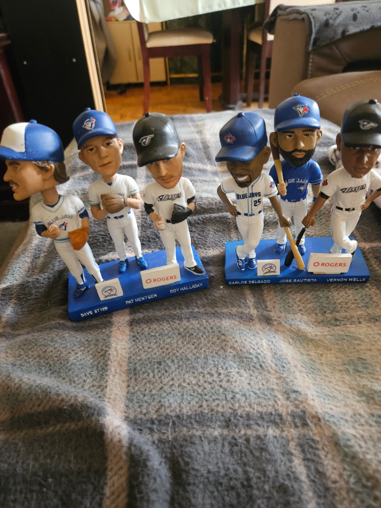 Collection of six Toronto Blue Jays bobbleheads. Features Dave Stieb, Pat Hentgen, Roy Halladay, Carlos Delgado, Jose Bautista, and Vernon Wells. Collectible figurines on a shared base. Rogers branding visible.
