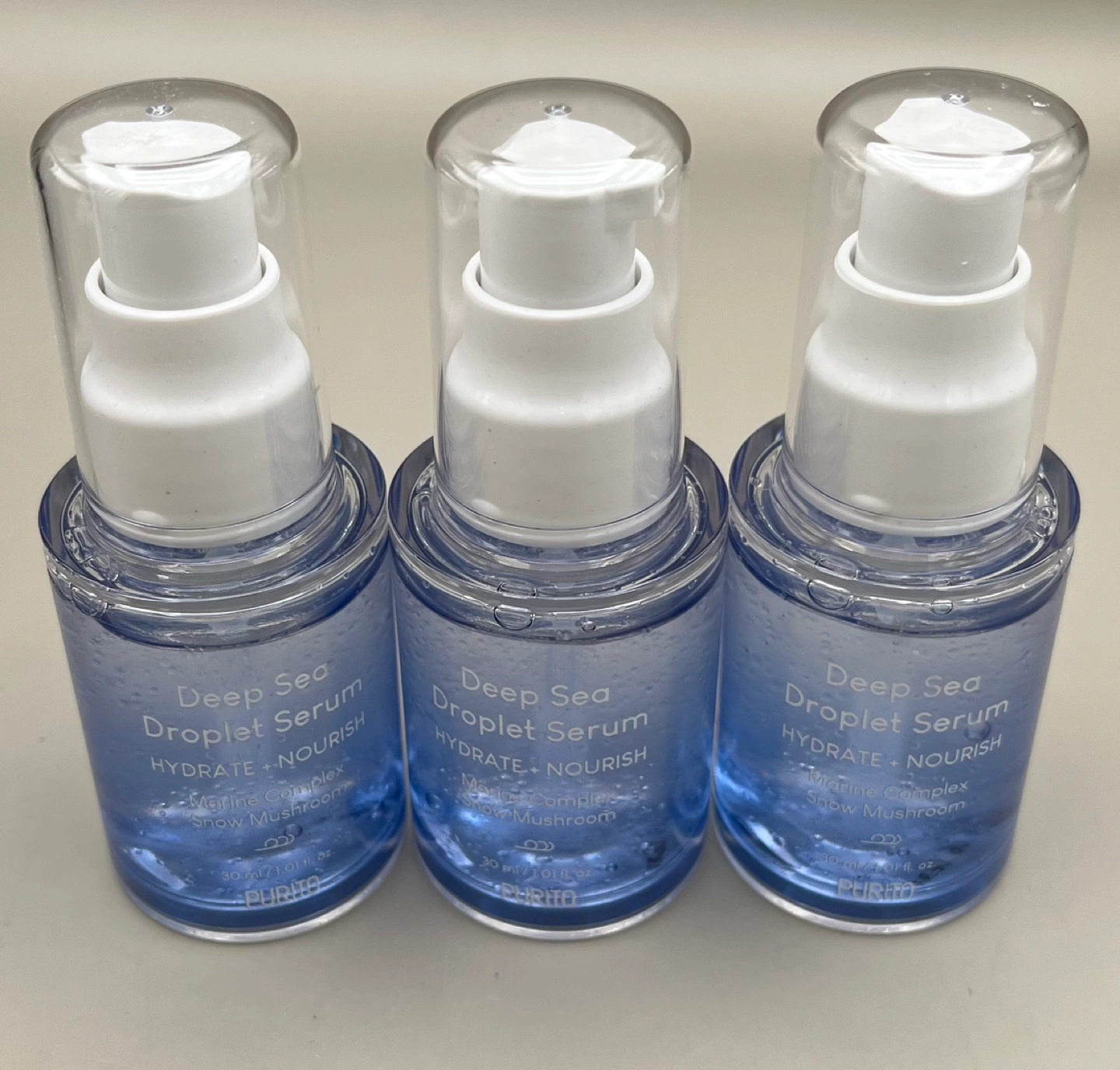 Three bottles of Purito Deep Sea Droplet Serum. Hydrates and nourishes. Contains a marine complex and snow mushroom. Vegan and cruelty-free. Sealed, unused.