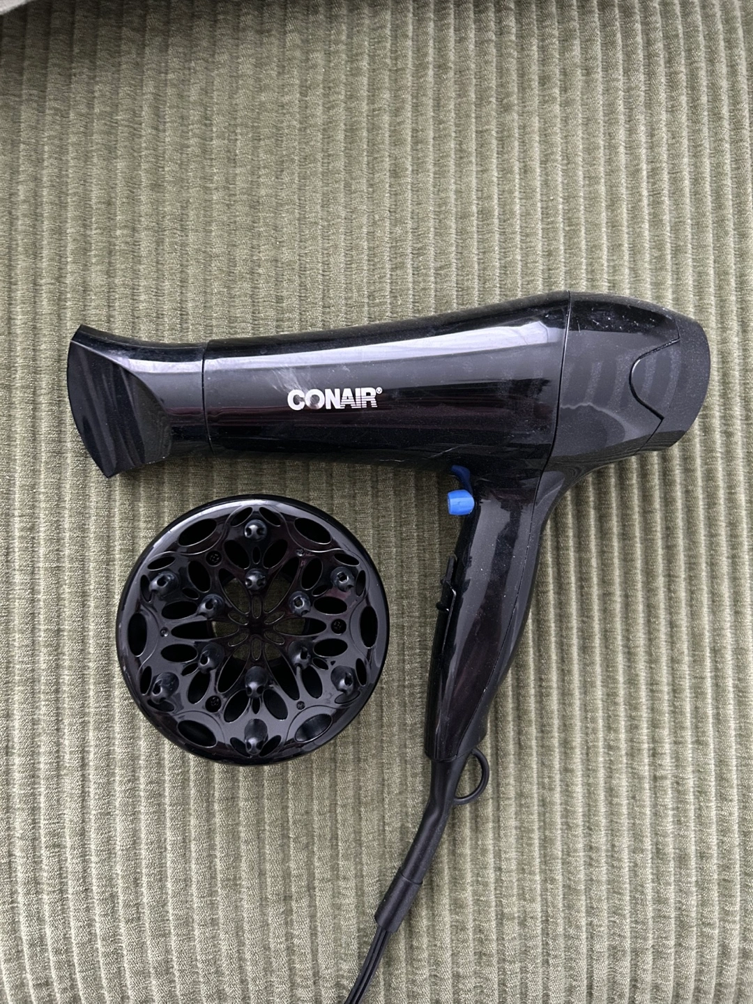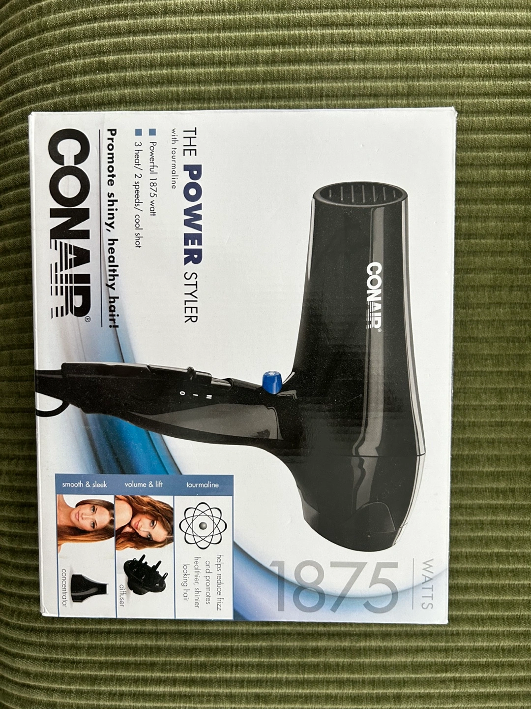 Black Conair hair dryer with 3 heat & 2 speed settings + cool temperature button. Includes concentrator and blowout attachment.