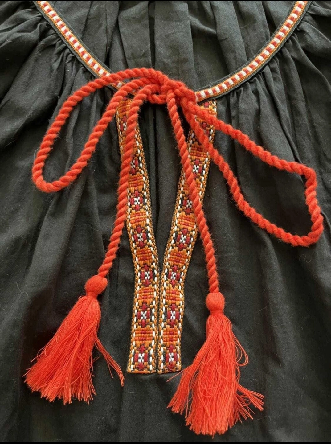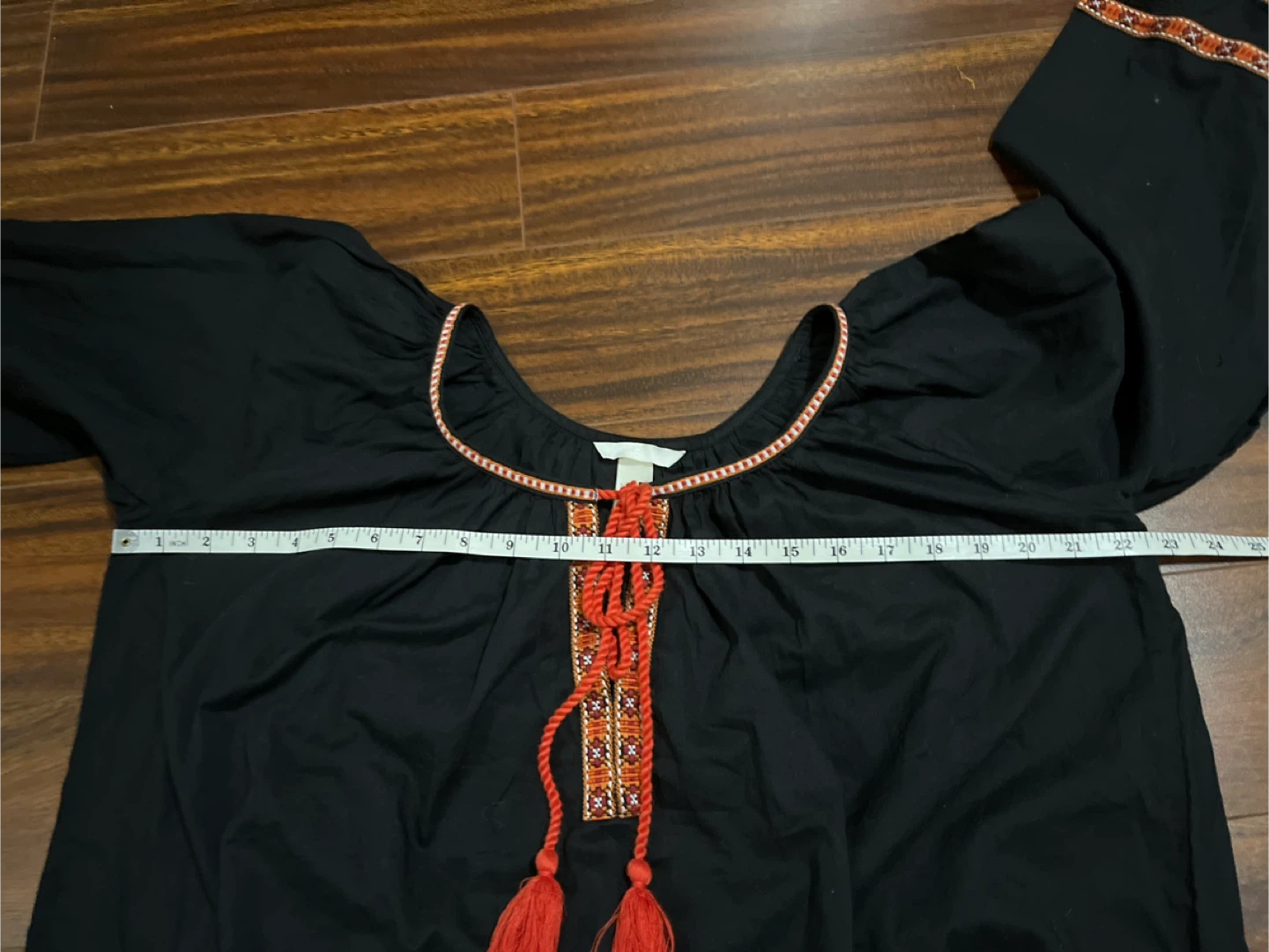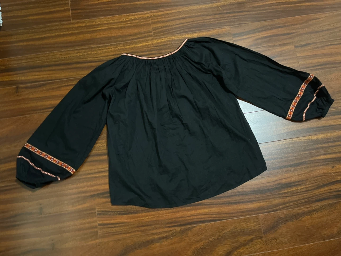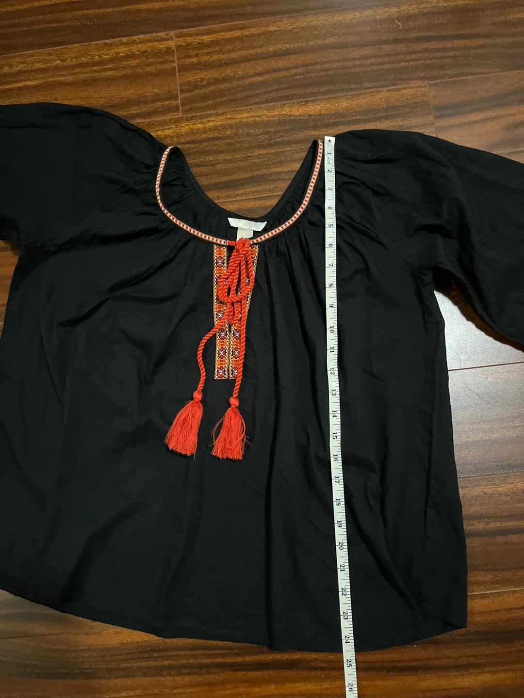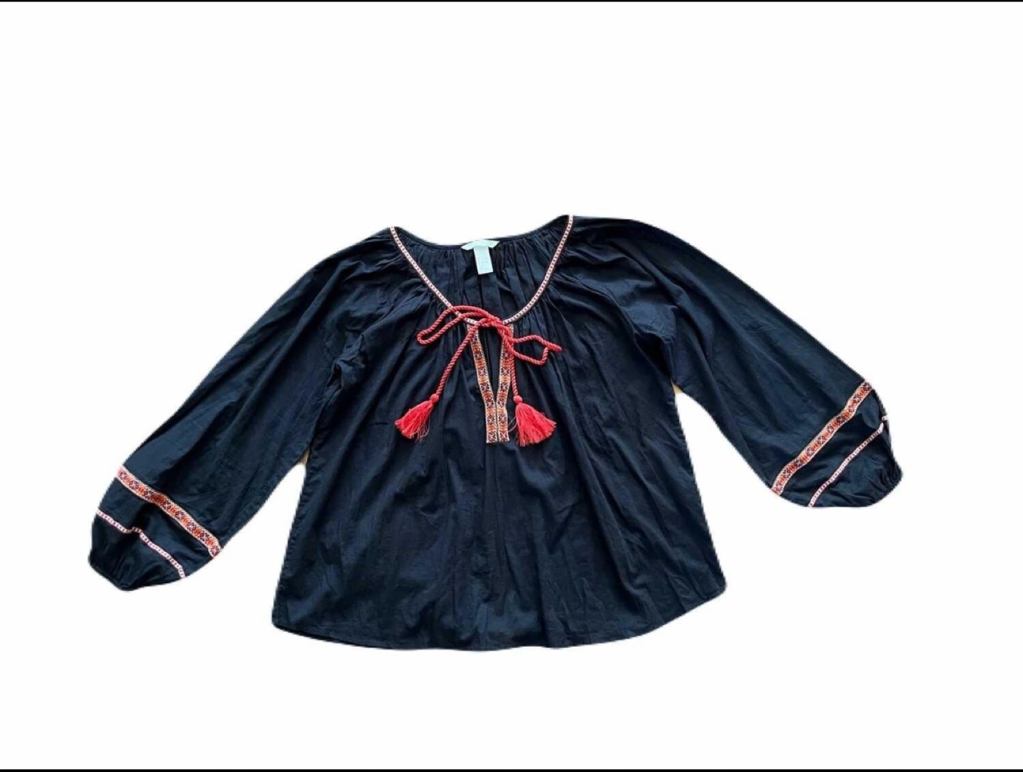 H&M women’s size 6 embroidered boho blouse in black. Features red and orange embroidery and tassel ties at the neckline. 100% cotton with relaxed fit and balloon sleeves.