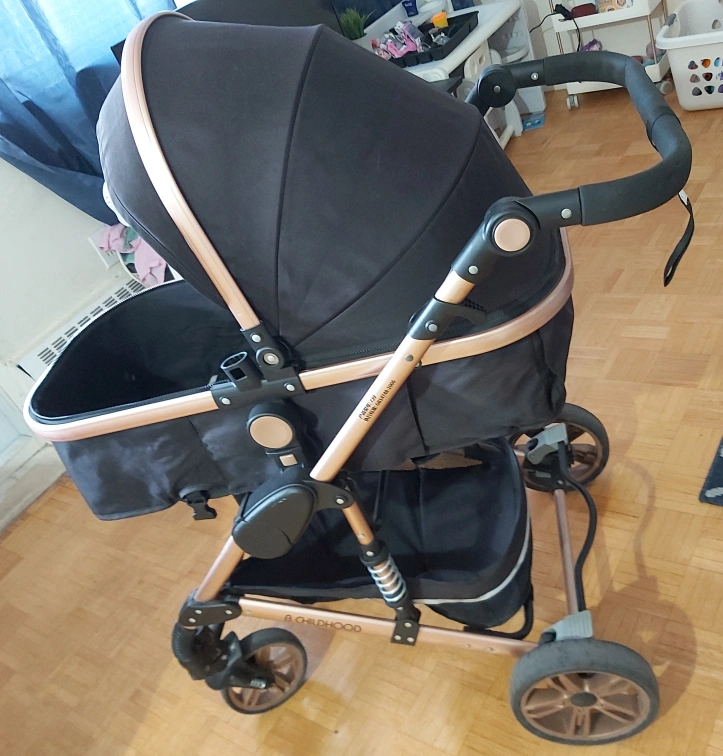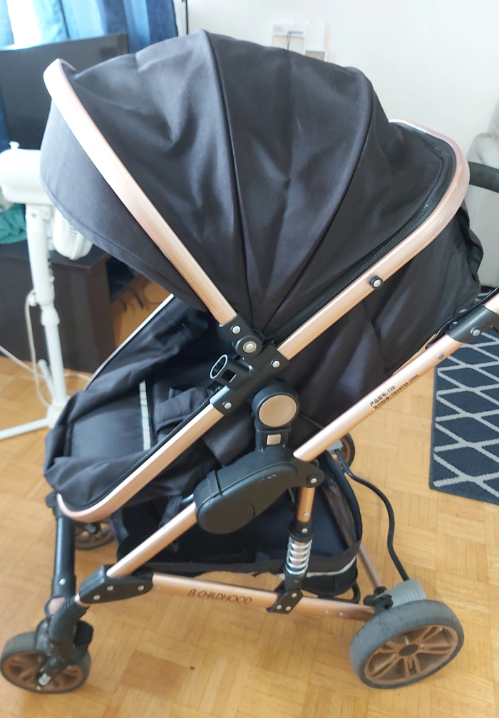 Lightweight stroller, rose gold accents. Black fabric. Suitable for 2-5 years Includes bassinet. Good condition.