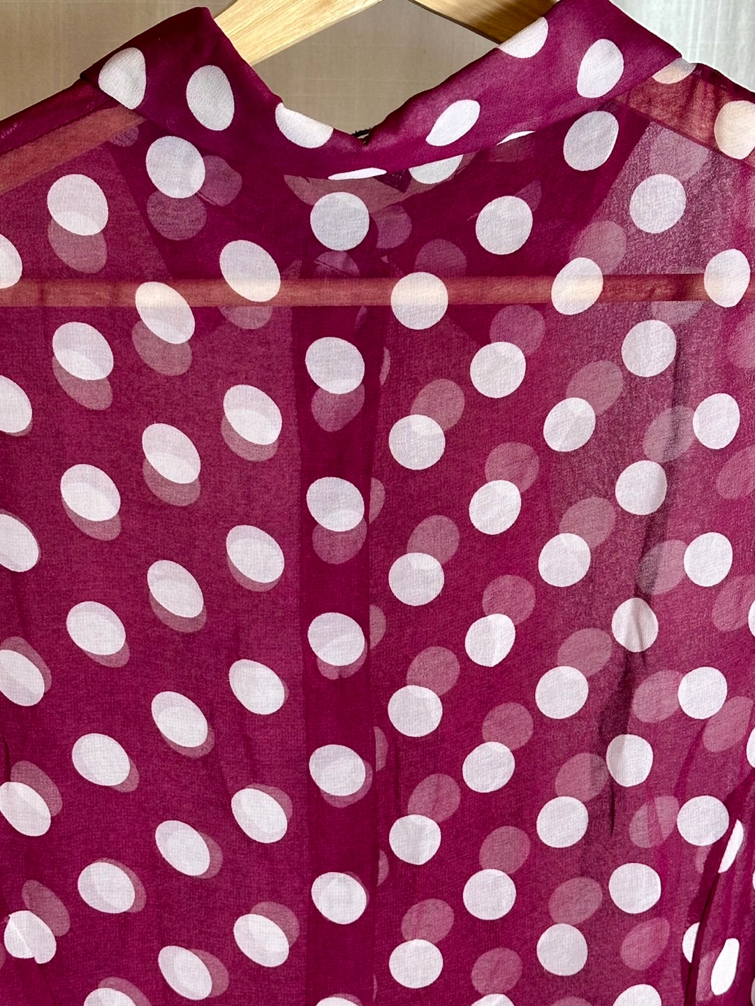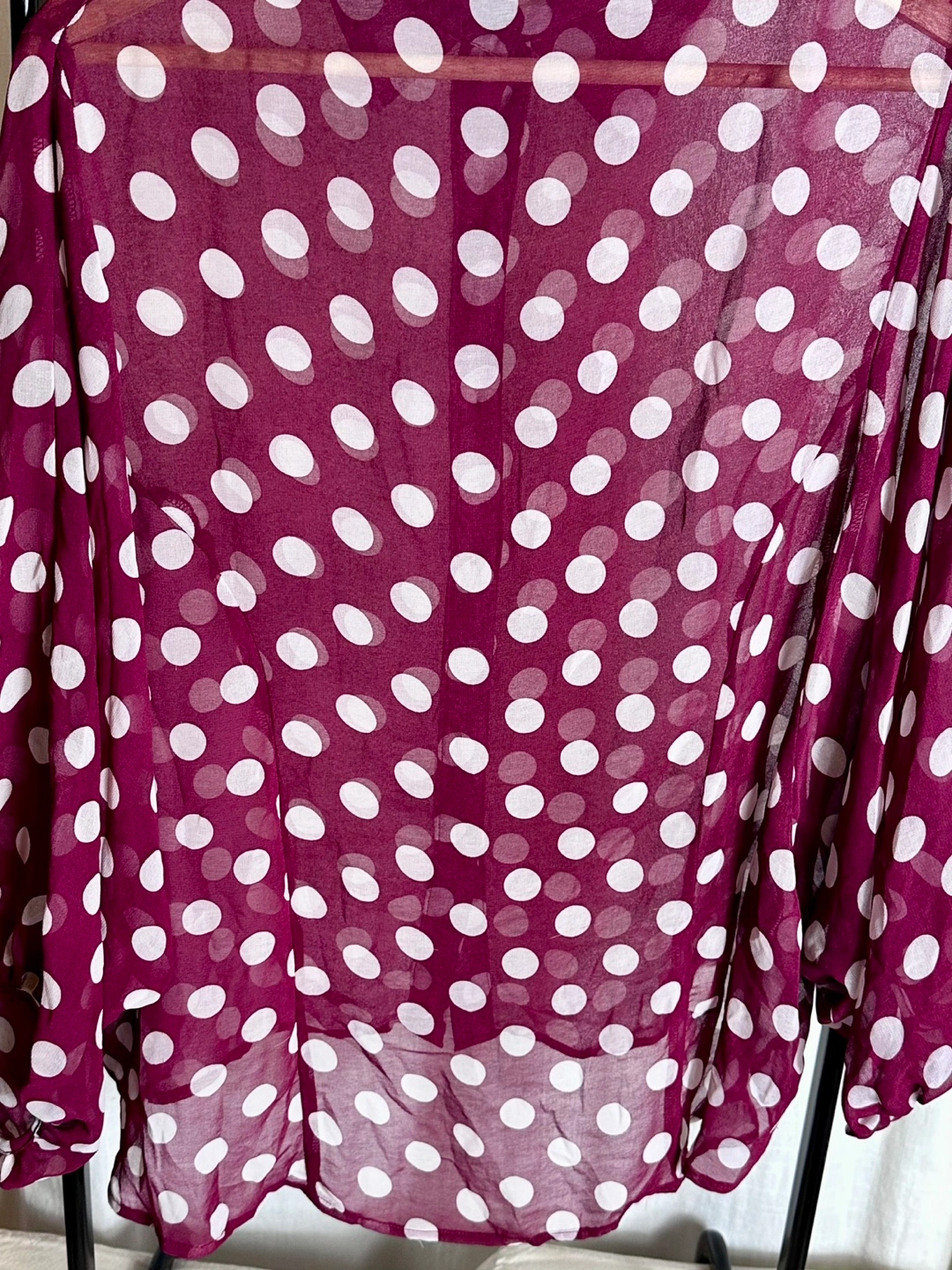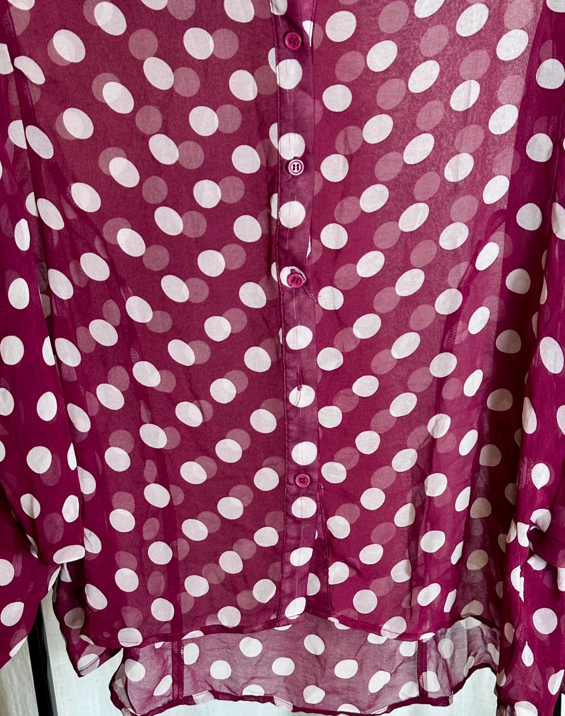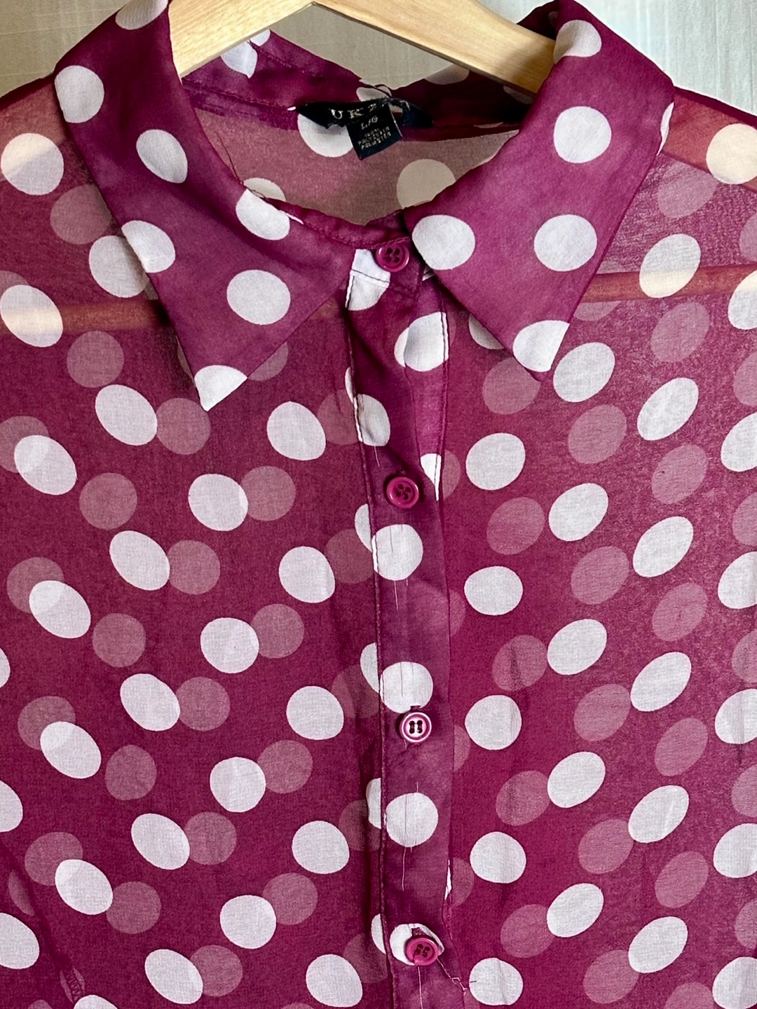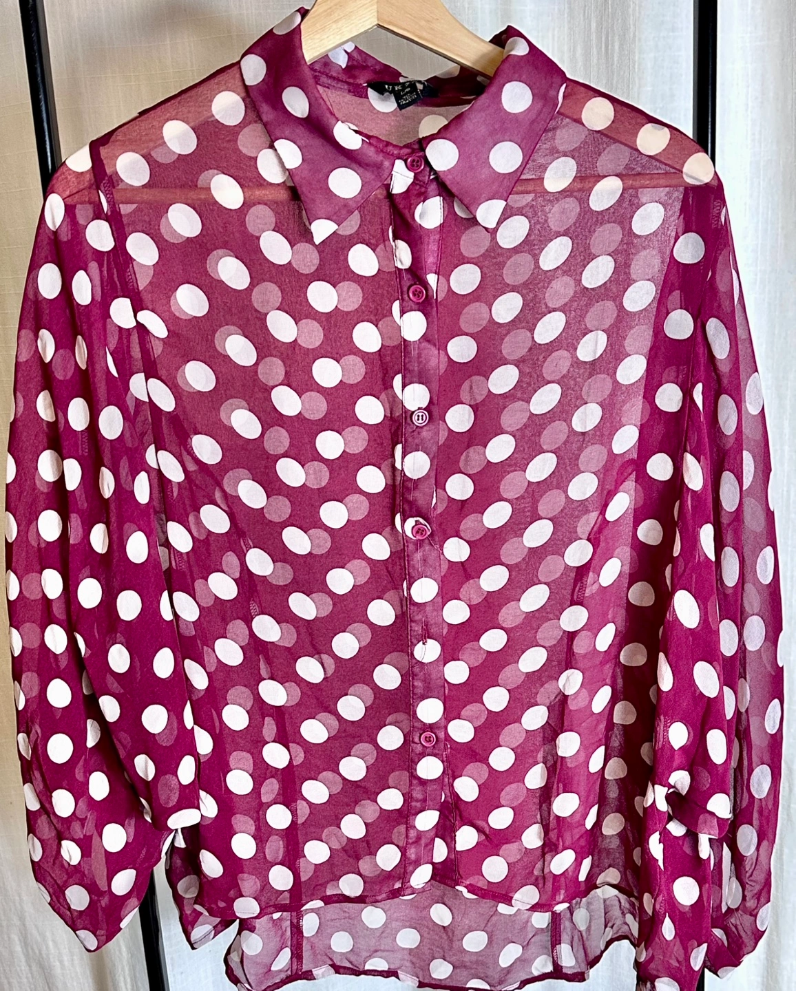 Women's maroon sheer blouse. Features white polka dots and a collared button-up front. Long sleeves. Size large. 100% polyester.