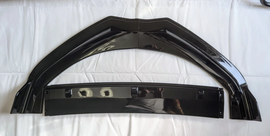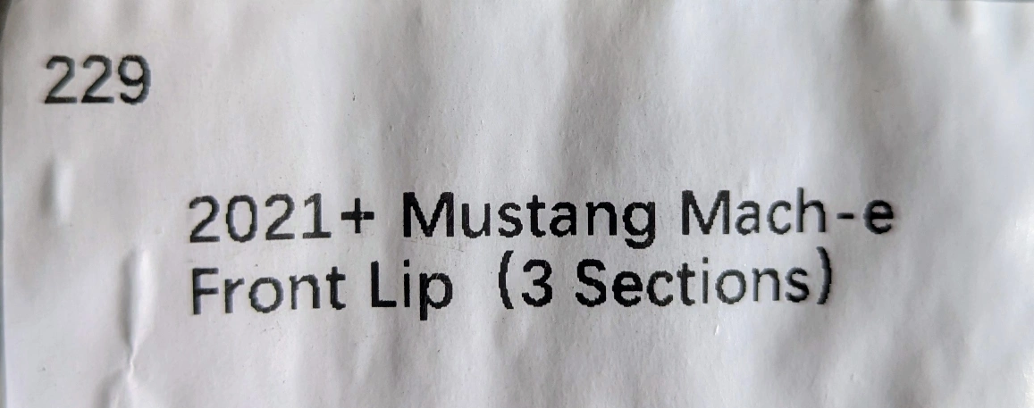 Gloss black front lip spoiler. Three-piece design. Fits 2021 and newer Mustang Mach-E.