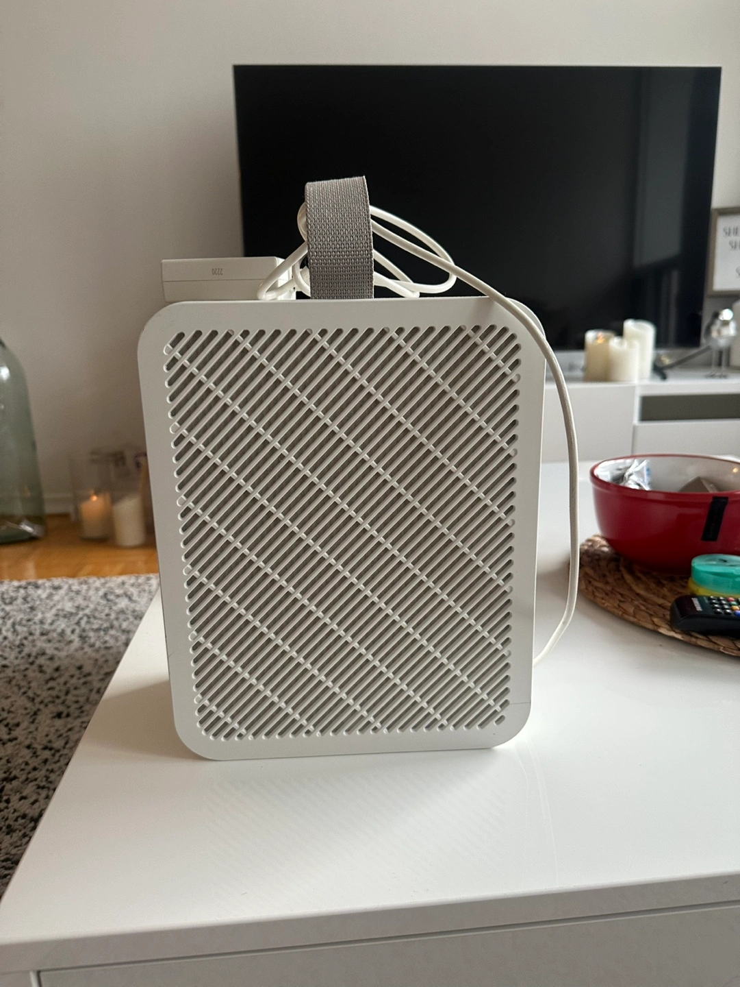 Compact air purifier. White colour. Good condition. Includes power cord. Great for small spaces.