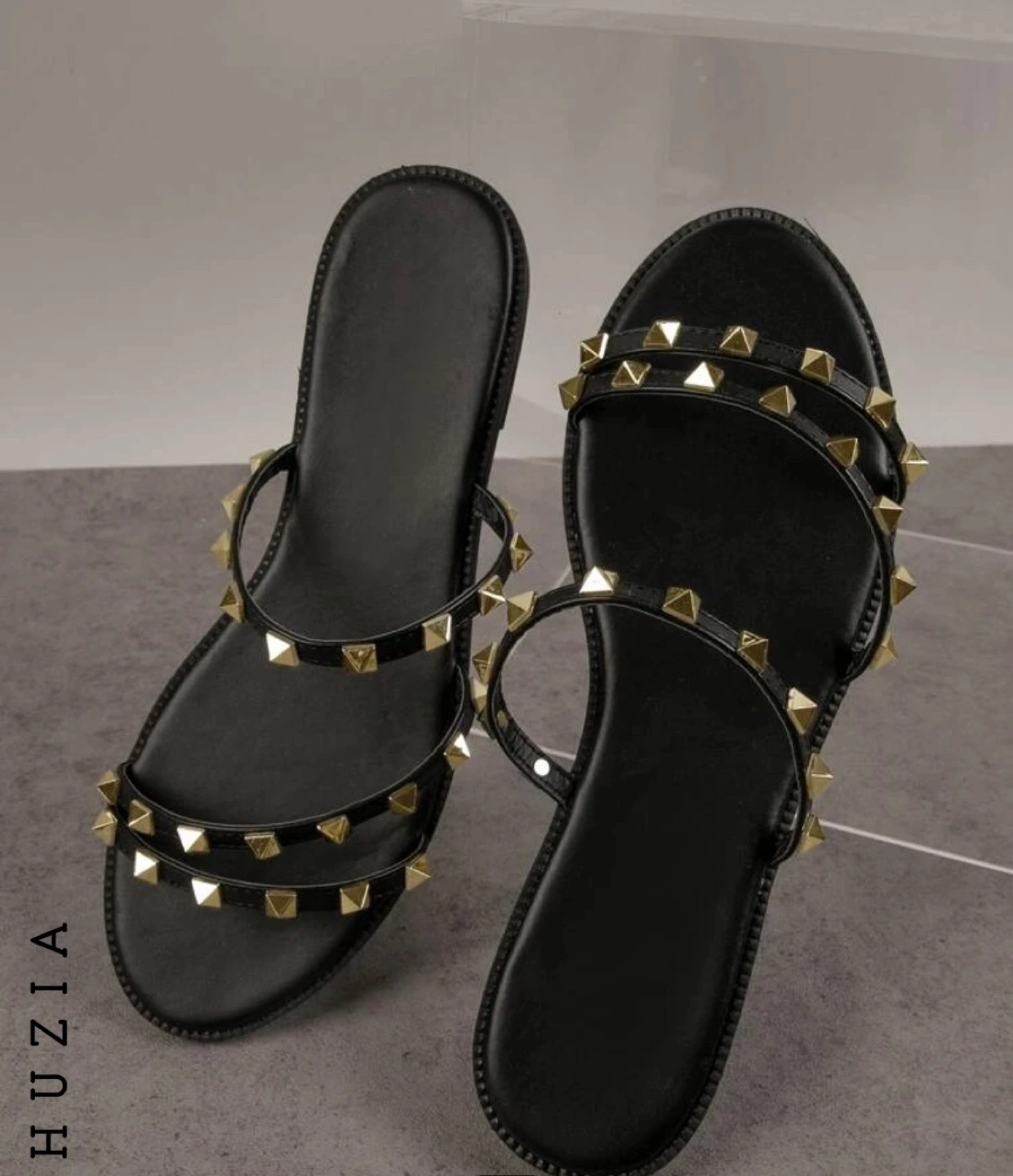 Pair of black flat sandals. Features gold-toned pyramid studs on straps. Simple slip-on style. Brand new, never worn.
