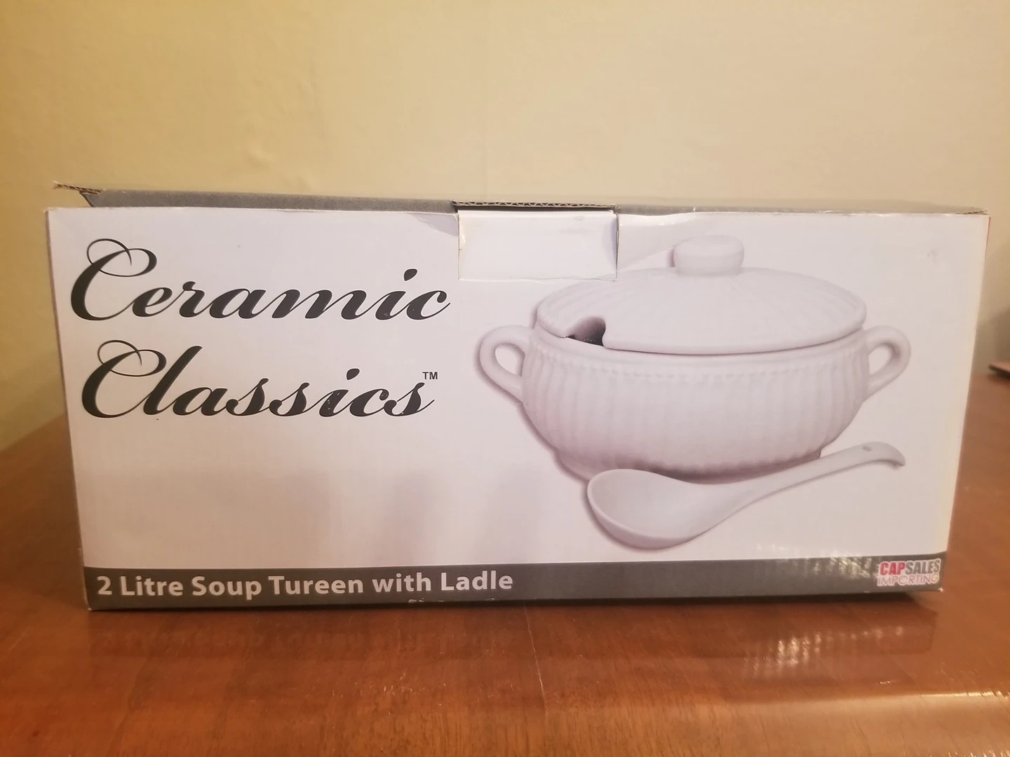 2-litre, white ceramic soup tureen with ladle. never used. still in box and wrapping. pick up at Bathurst and St Clair only.