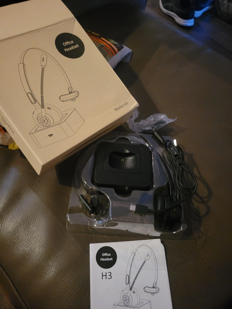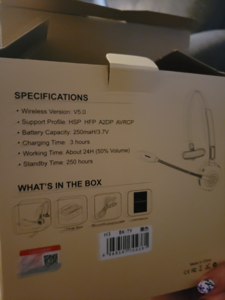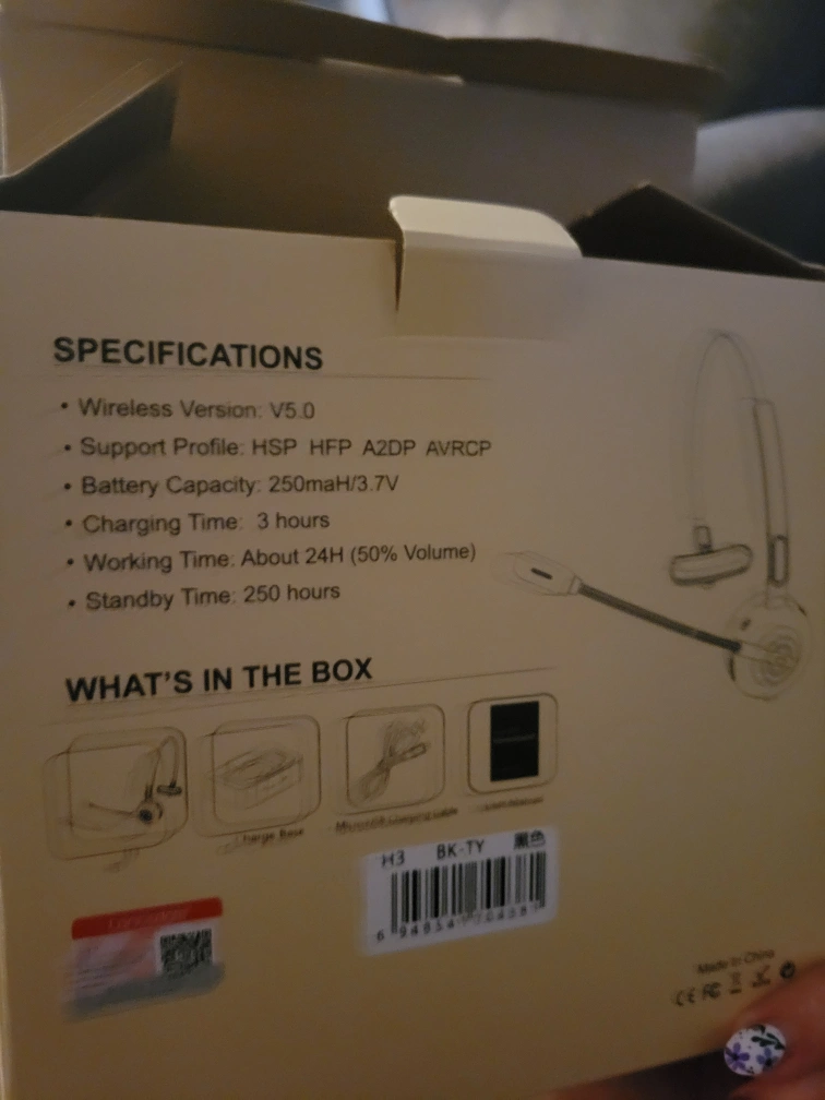 Brand new, never used. Wireless headset, model H3. Includes charging base and USB cable. 250mAh battery. About 24 hours working time at 50% volume. Bluetooth 5.0. Supports HSP, HFP, A2DP, AVRCP profiles.