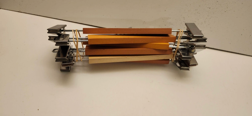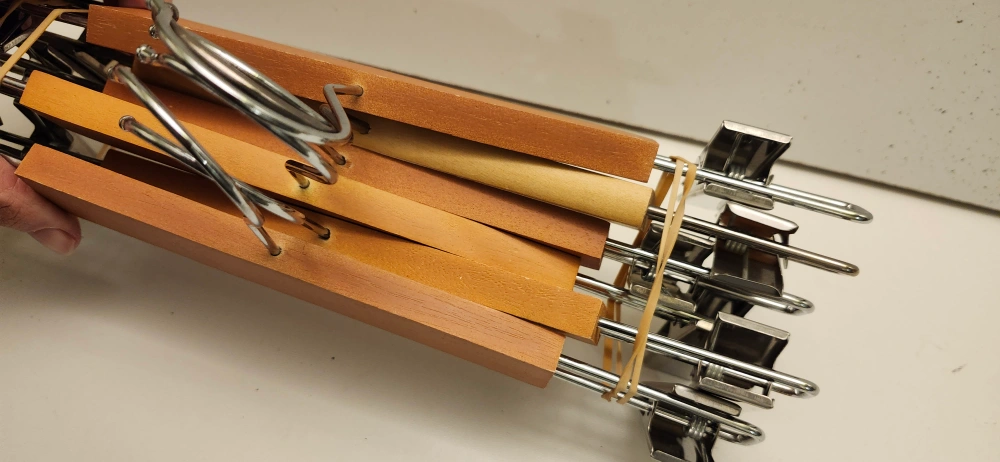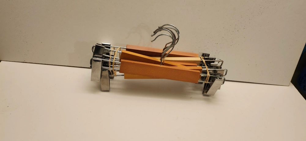 Eight wooden and metal clip hangers. Bundle of eight. Great for trousers or skirts. Chrome clips and wooden bars. price only cash only pickup no delivery. 801 O'Connor drive outside TD Canada Trust bank door.